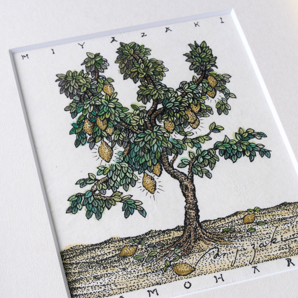 Since his twenties, Miyazaki has traveled repeatedly to North Africa, consistently depicting the wilderness and deserts he had admired since boyhood. This work is one of a three-part watercolor drawing series, centered on the fantastical vision of an orchard spreading across the desert.