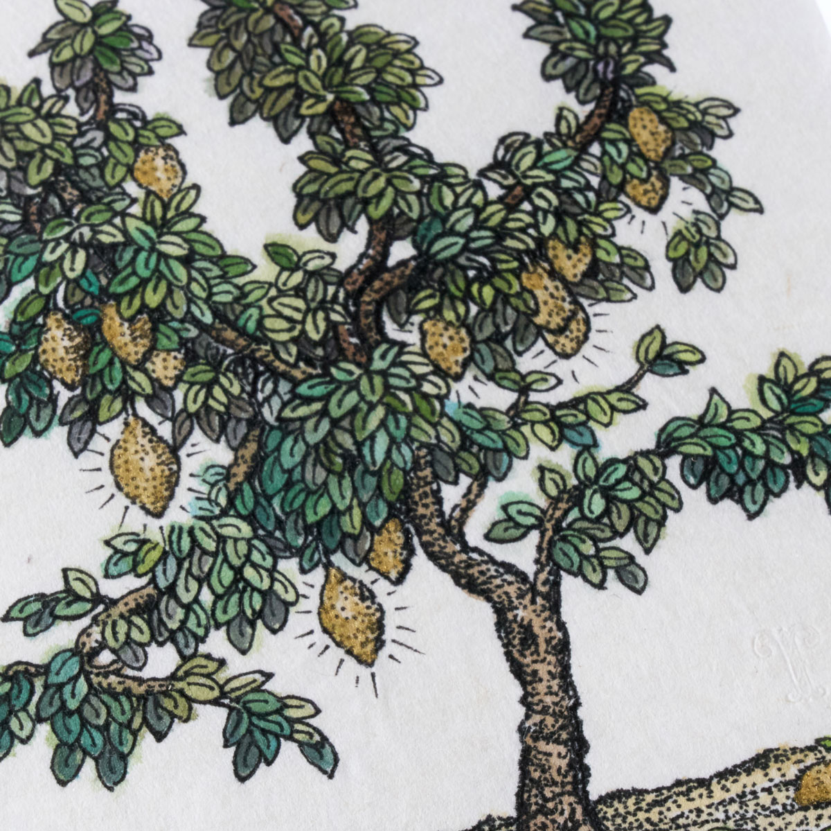 Shading is applied in ink on watercolor paper, and the image is then colored with watercolor pigments.