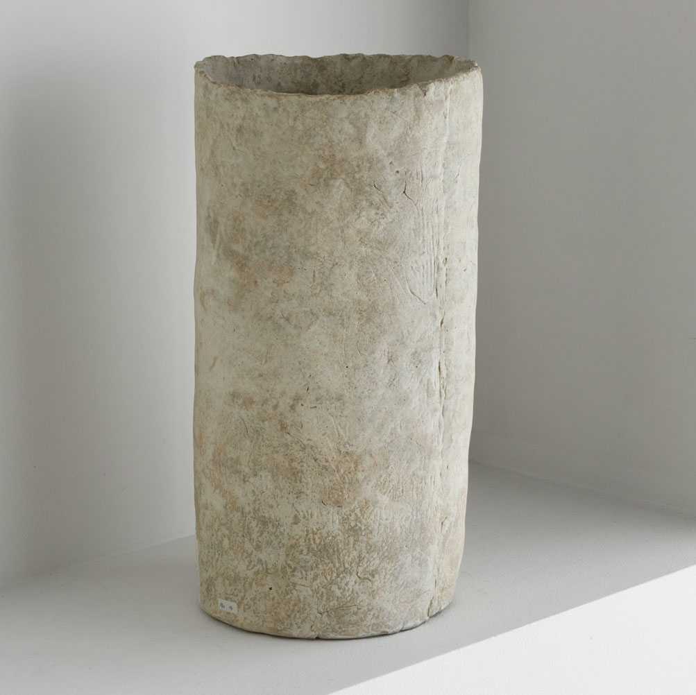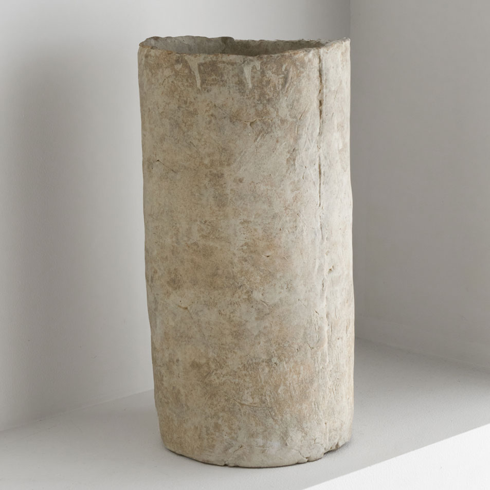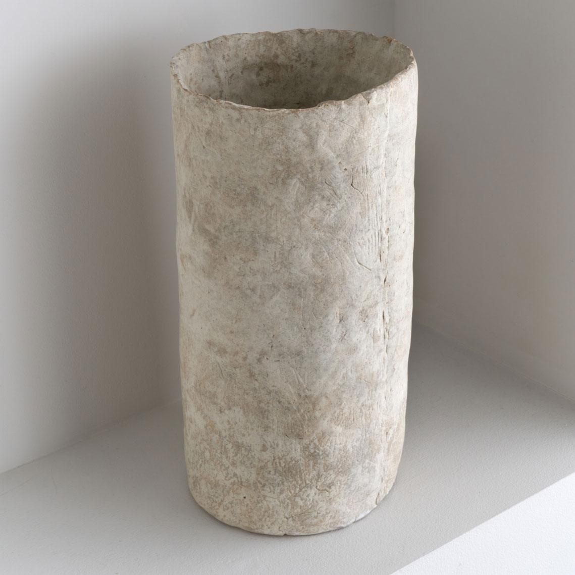 経塚筒をイメージして土で型で作り、その型を写し取ることで作品を生み出しています。経塚筒とは、平安時代後期から鎌倉時代にかけて盛んに築かれた「経塚」に、仏教経典を納めるために用いられた筒形の容器です。
