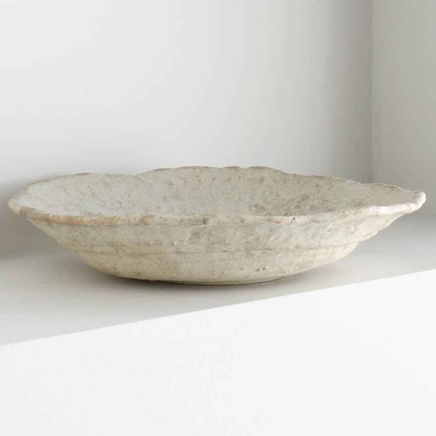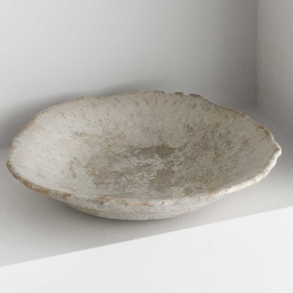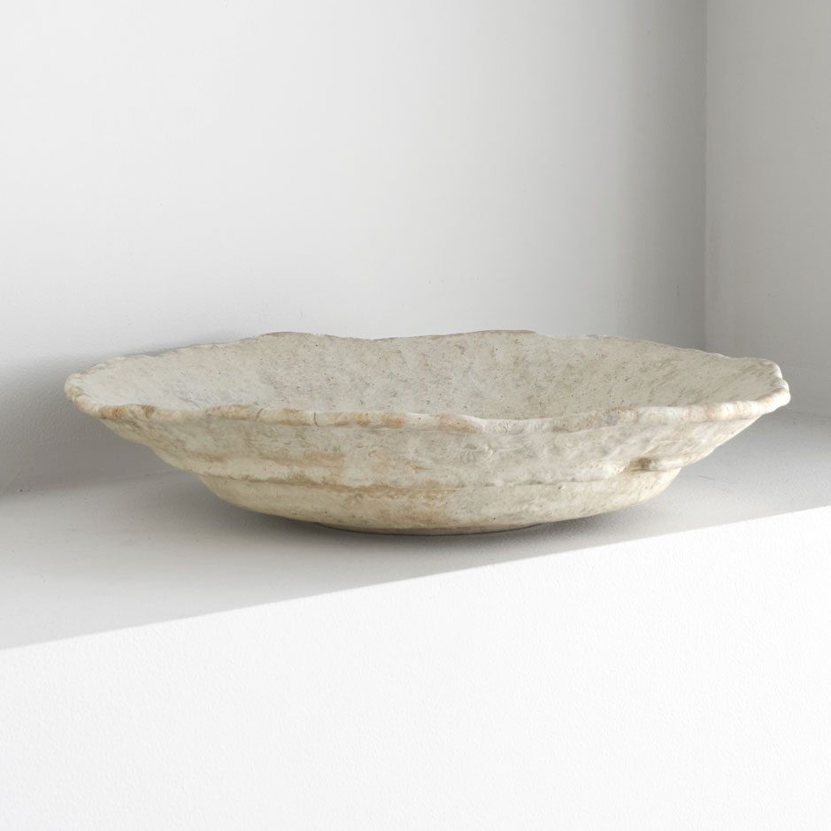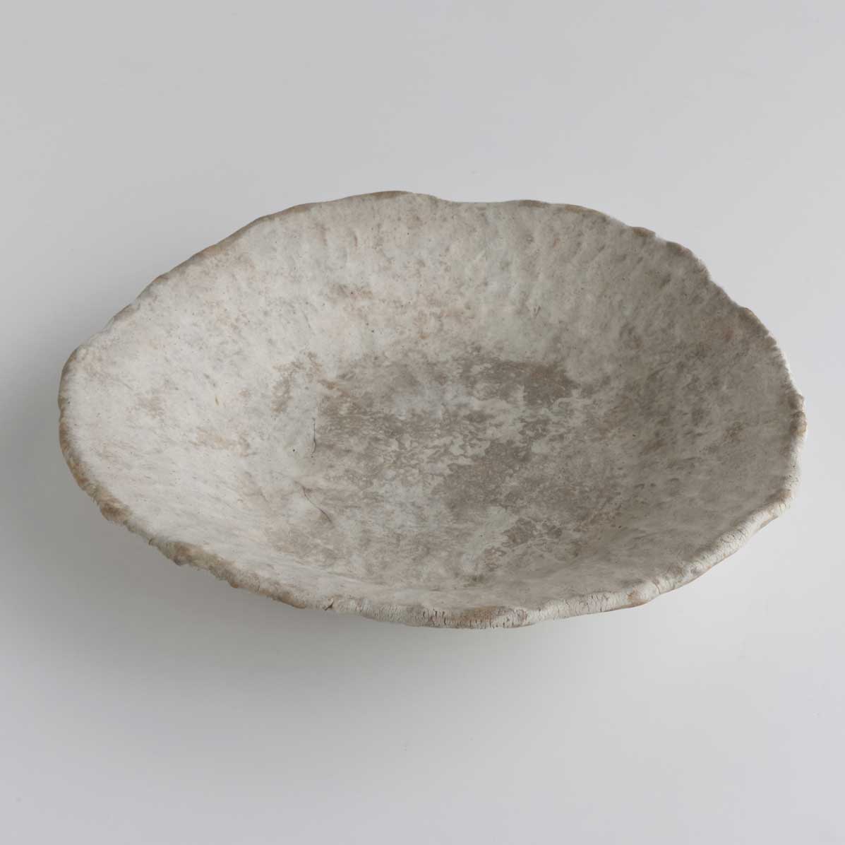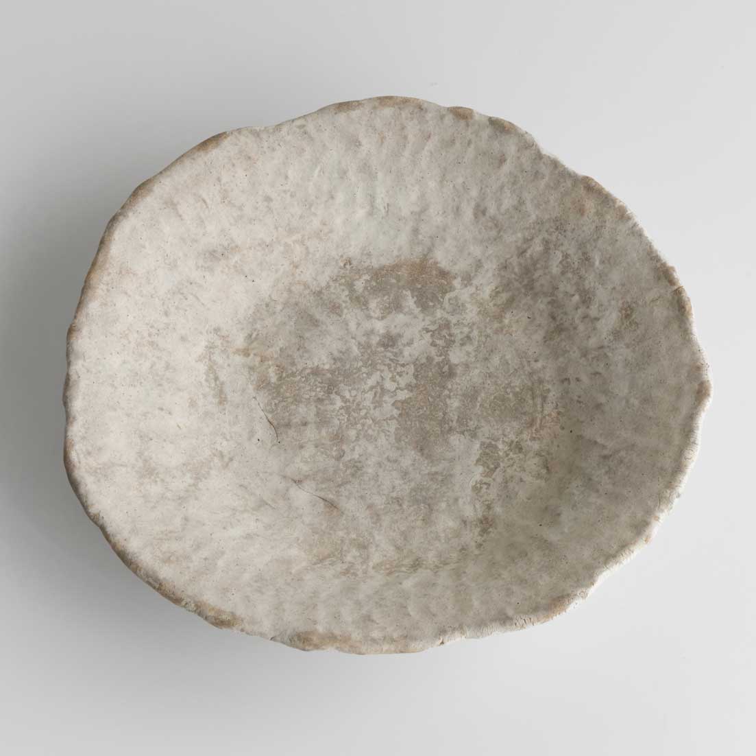 昔の瀬戸の石皿からさらに自分なりに造形し直したもので土型を作り、その型を写し取ることで作品を生み出しています。うつわとしてお使いいただけます。ご使用の際は、盛り付け前に器をさっと水にくぐらせていただくことをおすすめいたします。