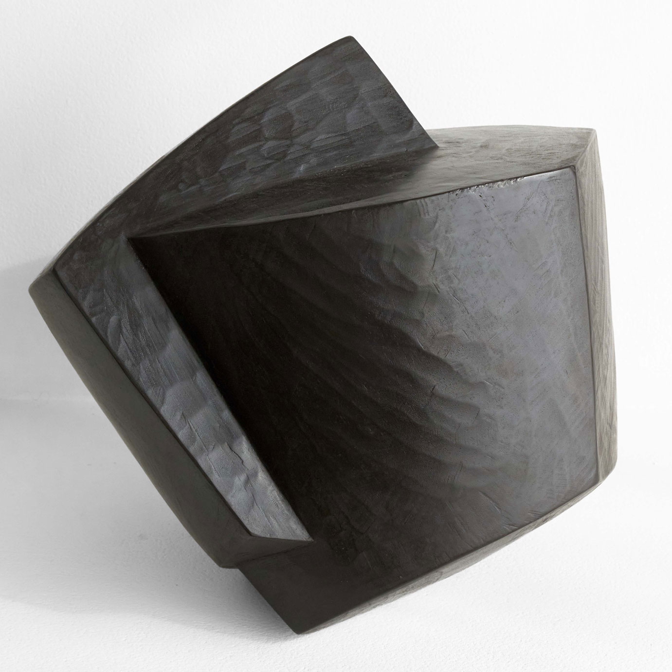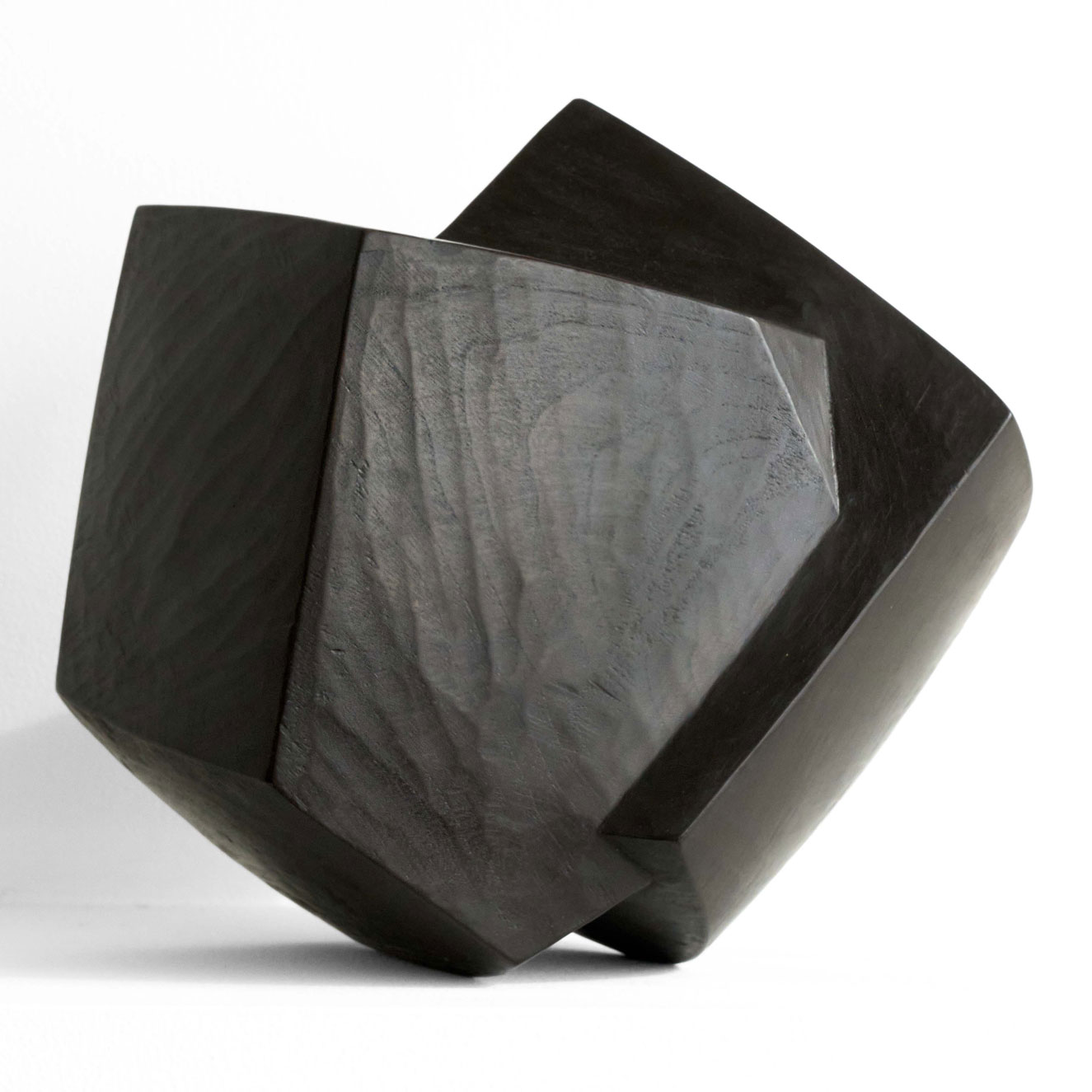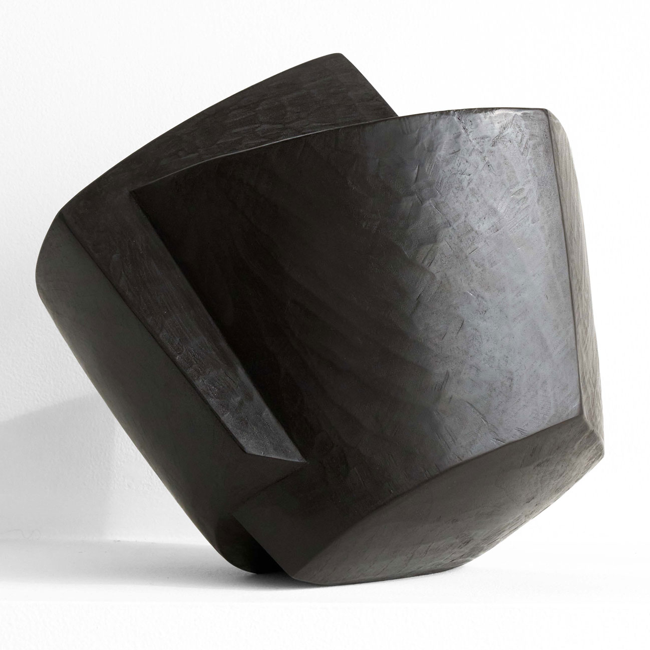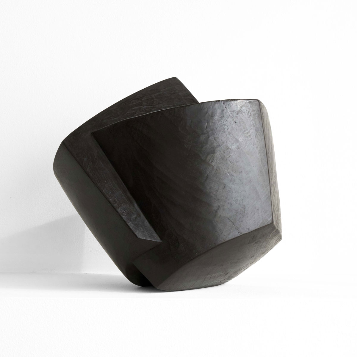 二つの形が合わさった造形。楠木をノミの跡が残る力強い表情と、シャープなエッジとのコントラストが、漆の深い黒と響き合い、凛とした存在感を放ちます。様々な角度から楽しめる作品です。