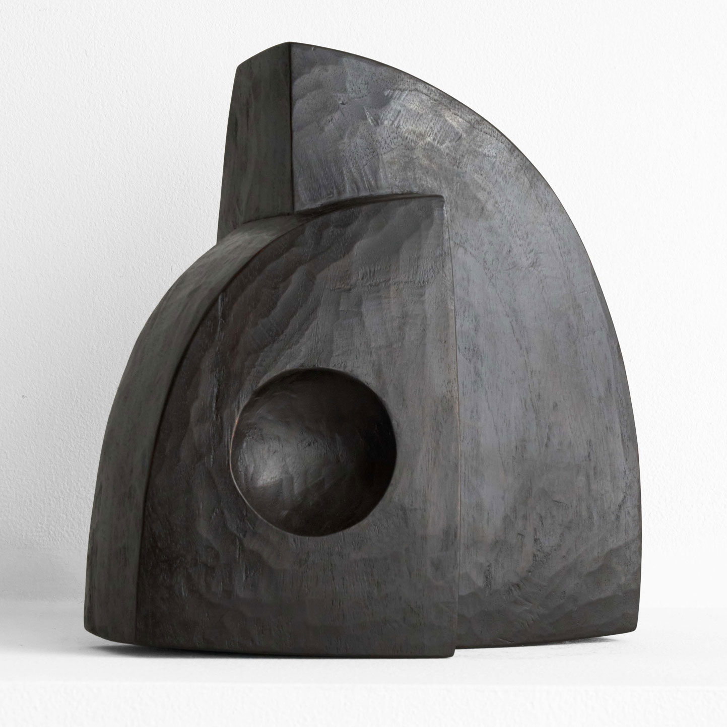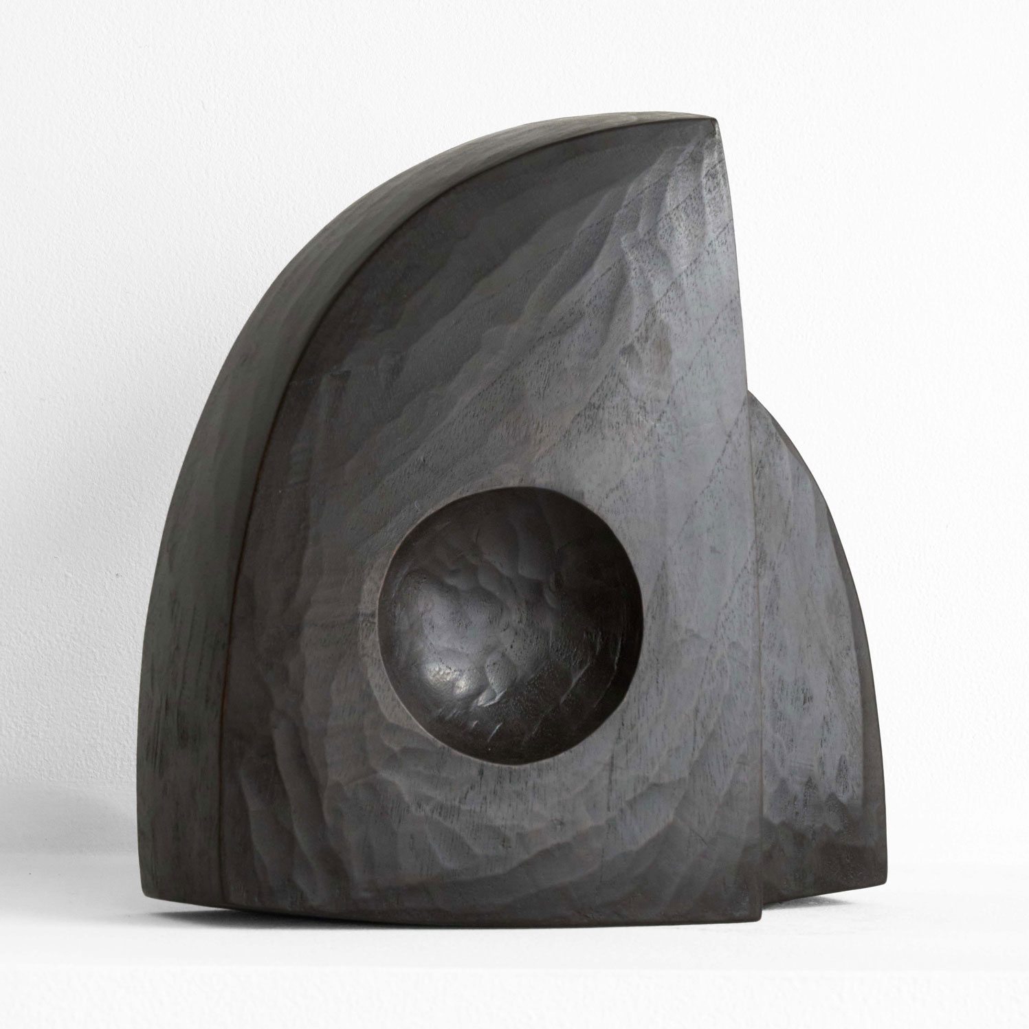 二つの形が合わさった造形。楠木をノミの跡が残る力強い表情と、シャープなエッジとのコントラストが、漆の深い黒と響き合い、凛とした存在感を放ちます。様々な角度から楽しめる作品です。