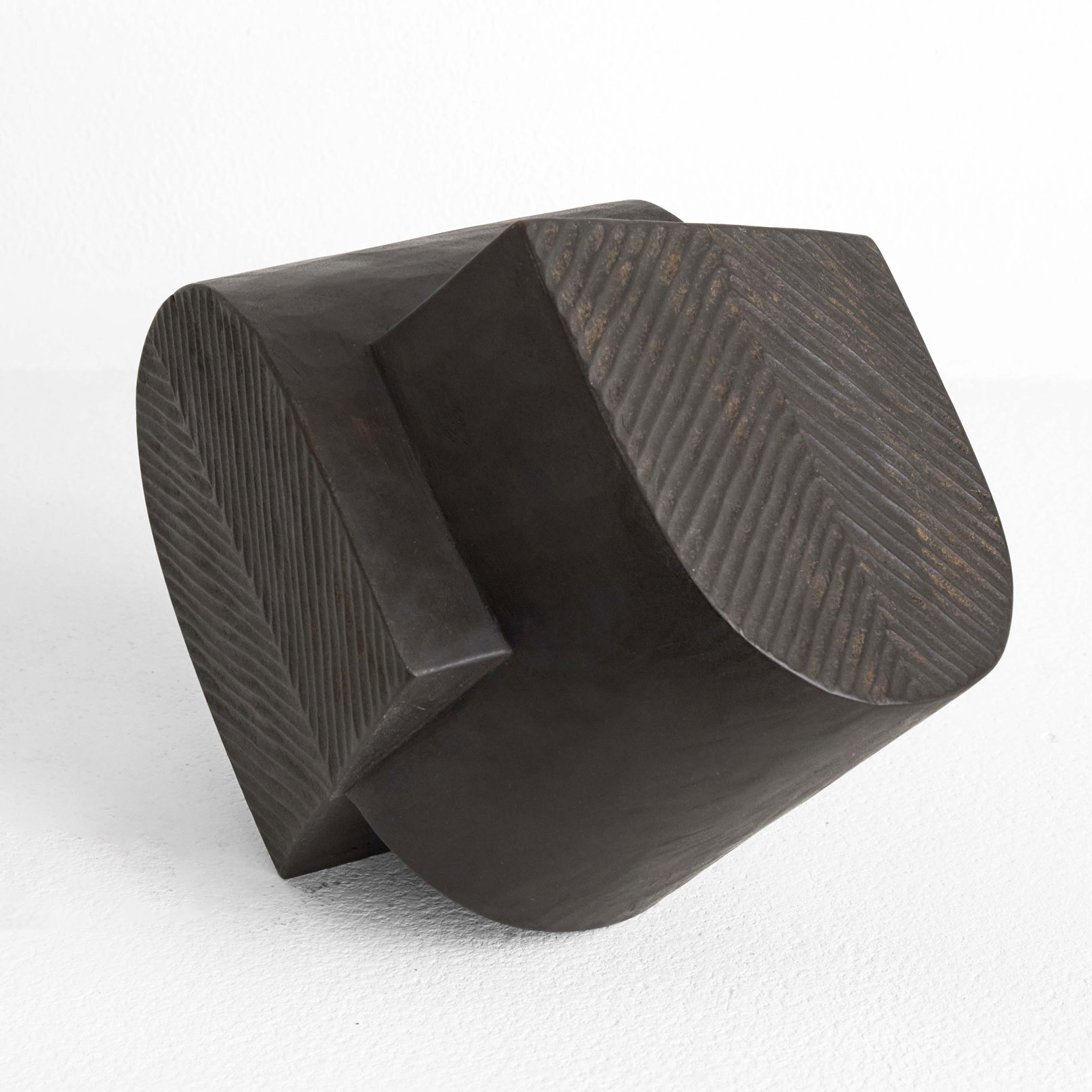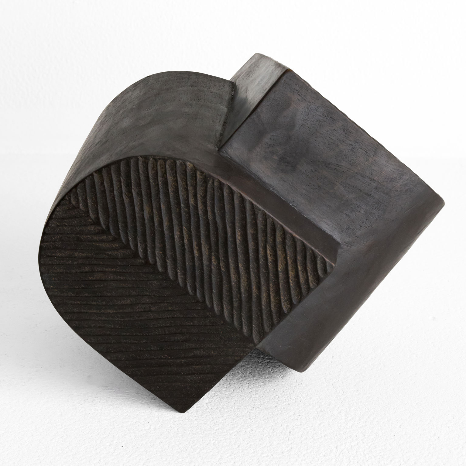 二つの形が合わさった造形。楠木をノミの跡が残る力強い表情と、シャープなエッジとのコントラストが、漆の深い黒と響き合い、凛とした存在感を放ちます。様々な角度から楽しめる作品です。