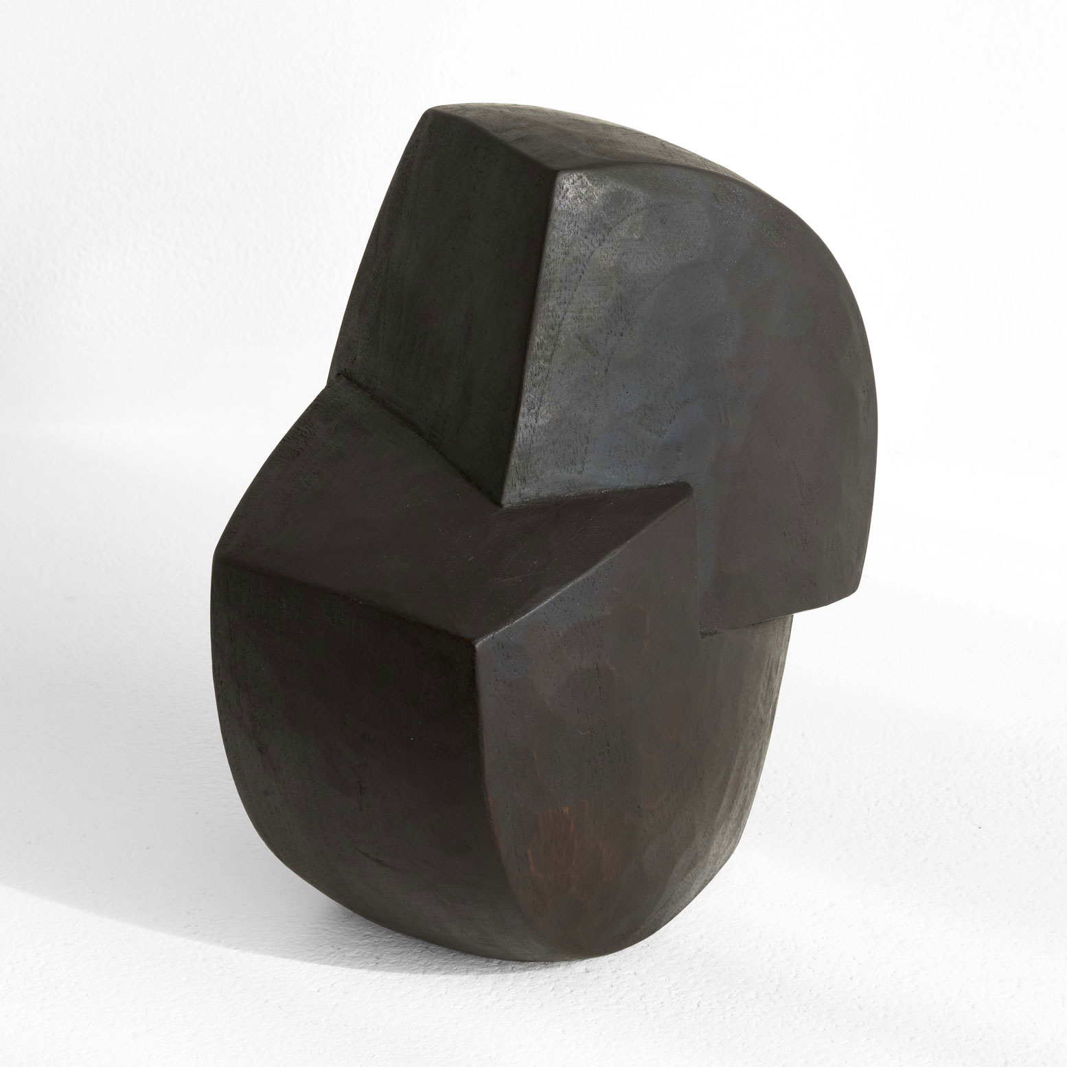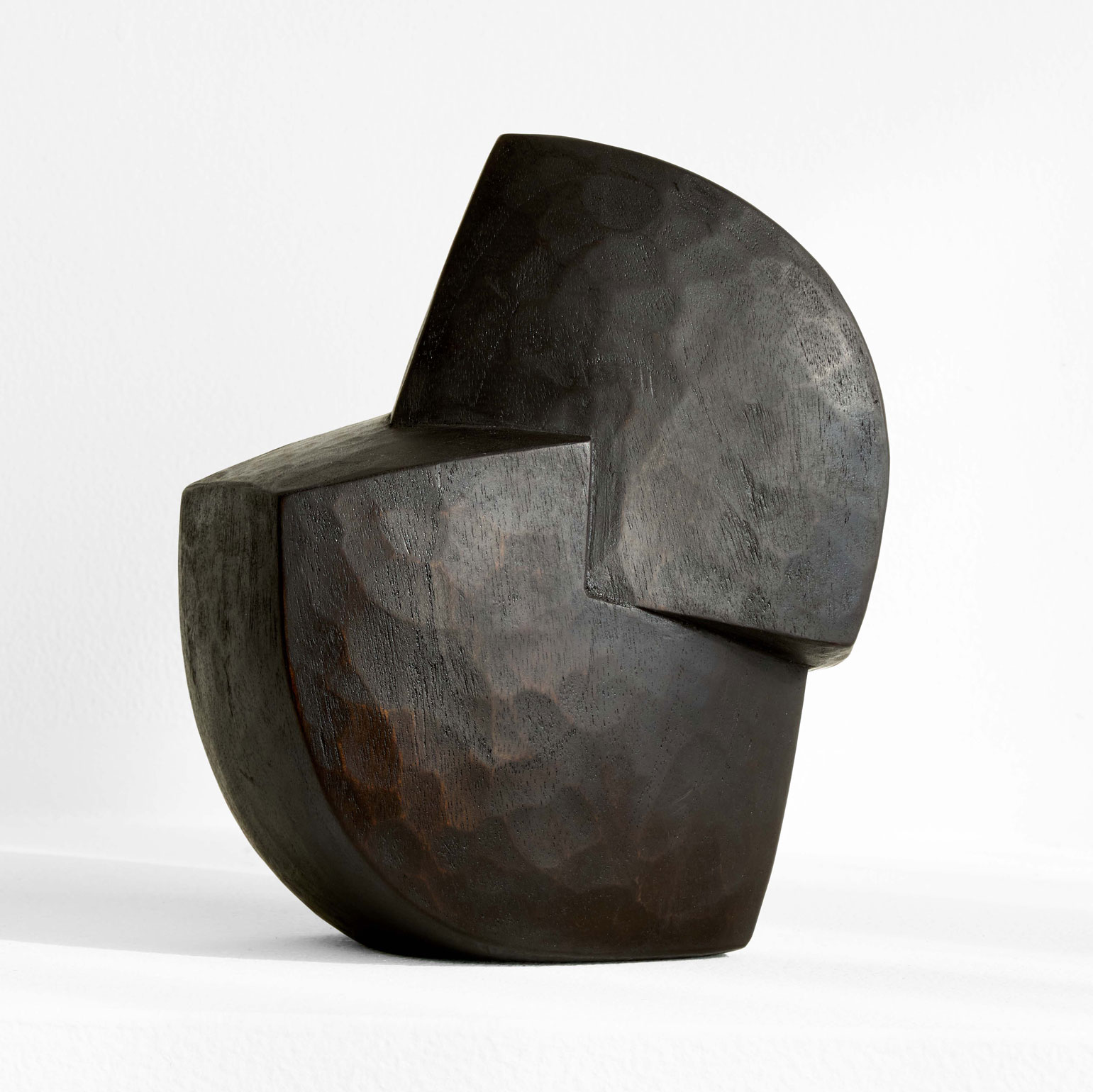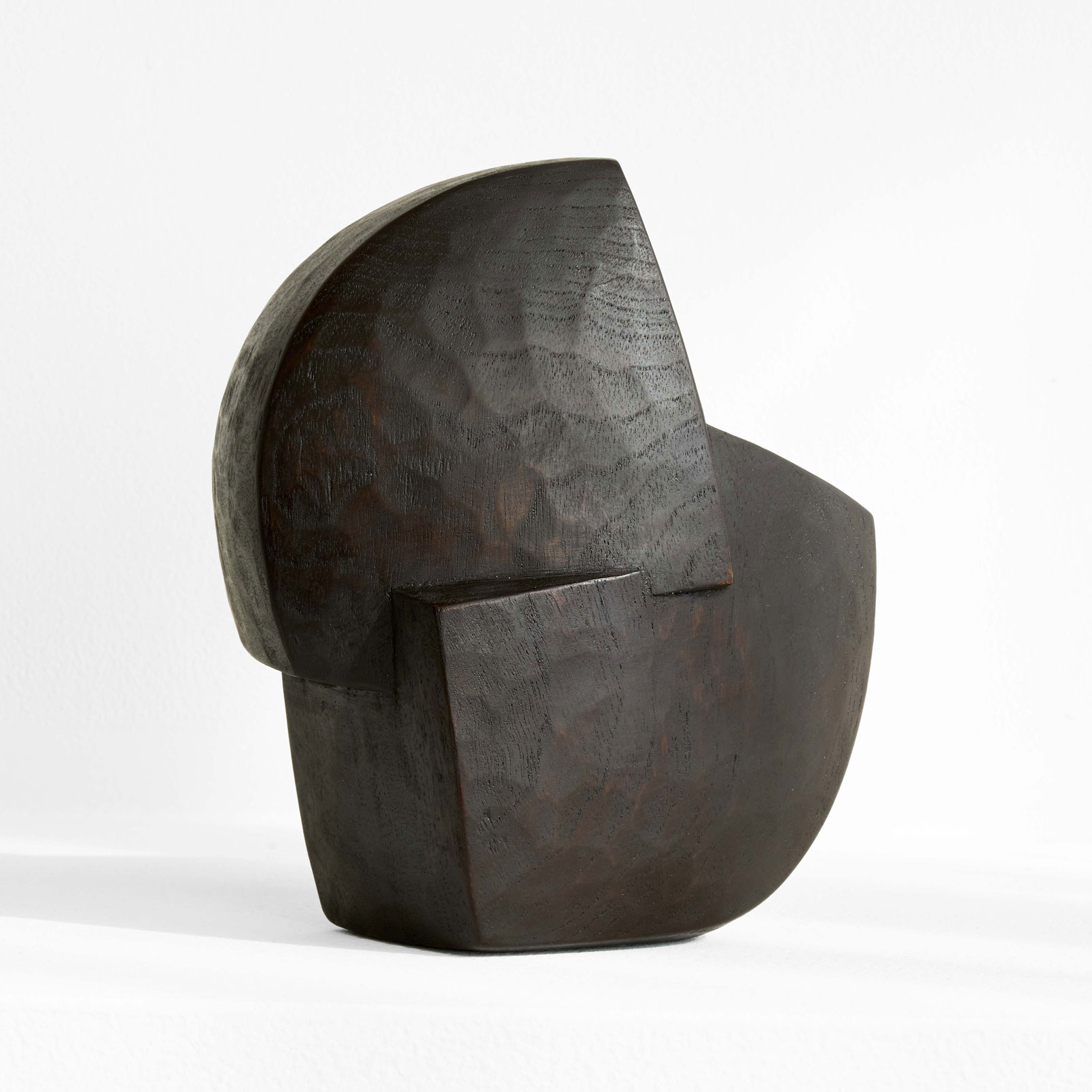 二つの形が合わさった造形。楠木をノミの跡が残る力強い表情と、シャープなエッジとのコントラストが、漆の深い黒と響き合い、凛とした存在感を放ちます。様々な角度から楽しめる作品です。