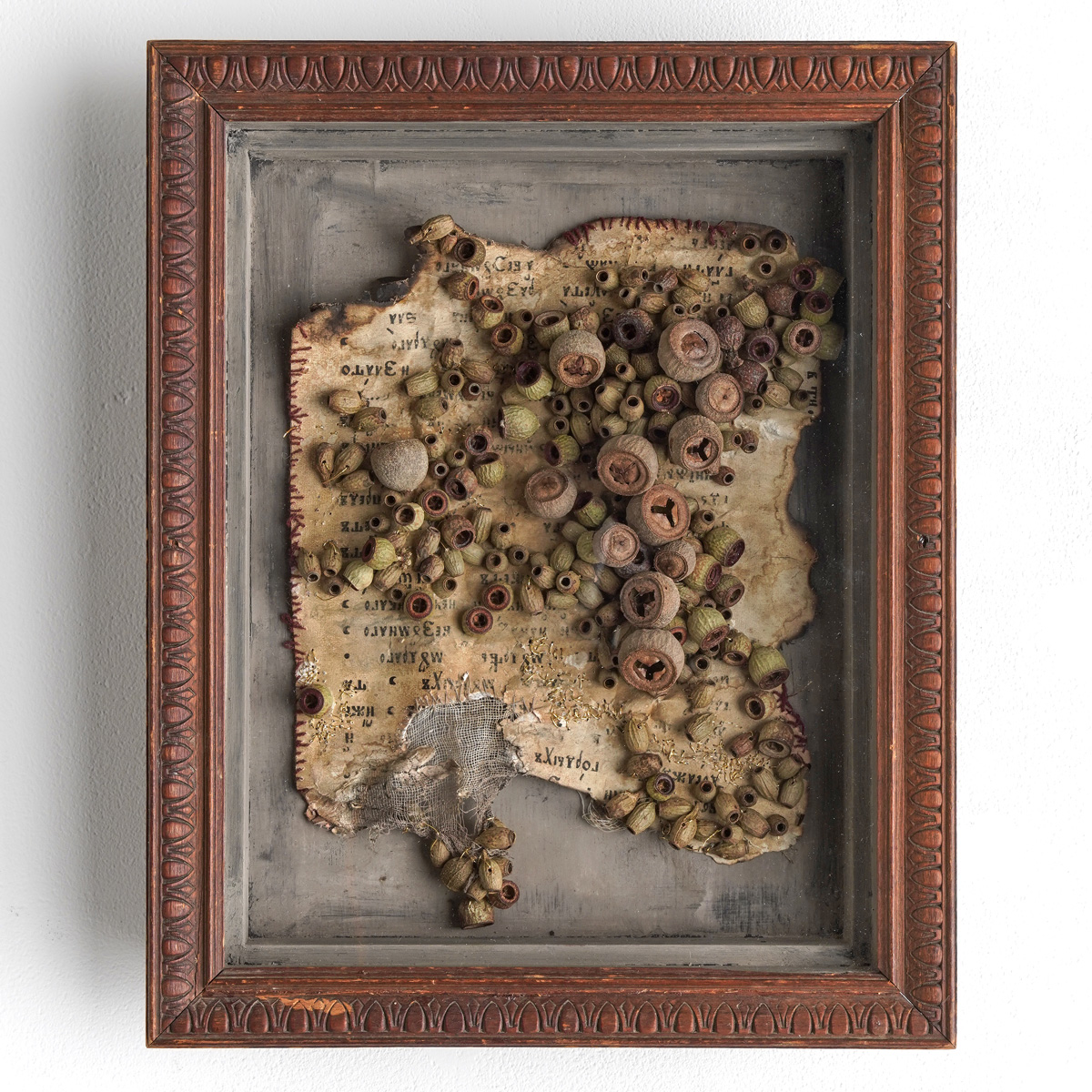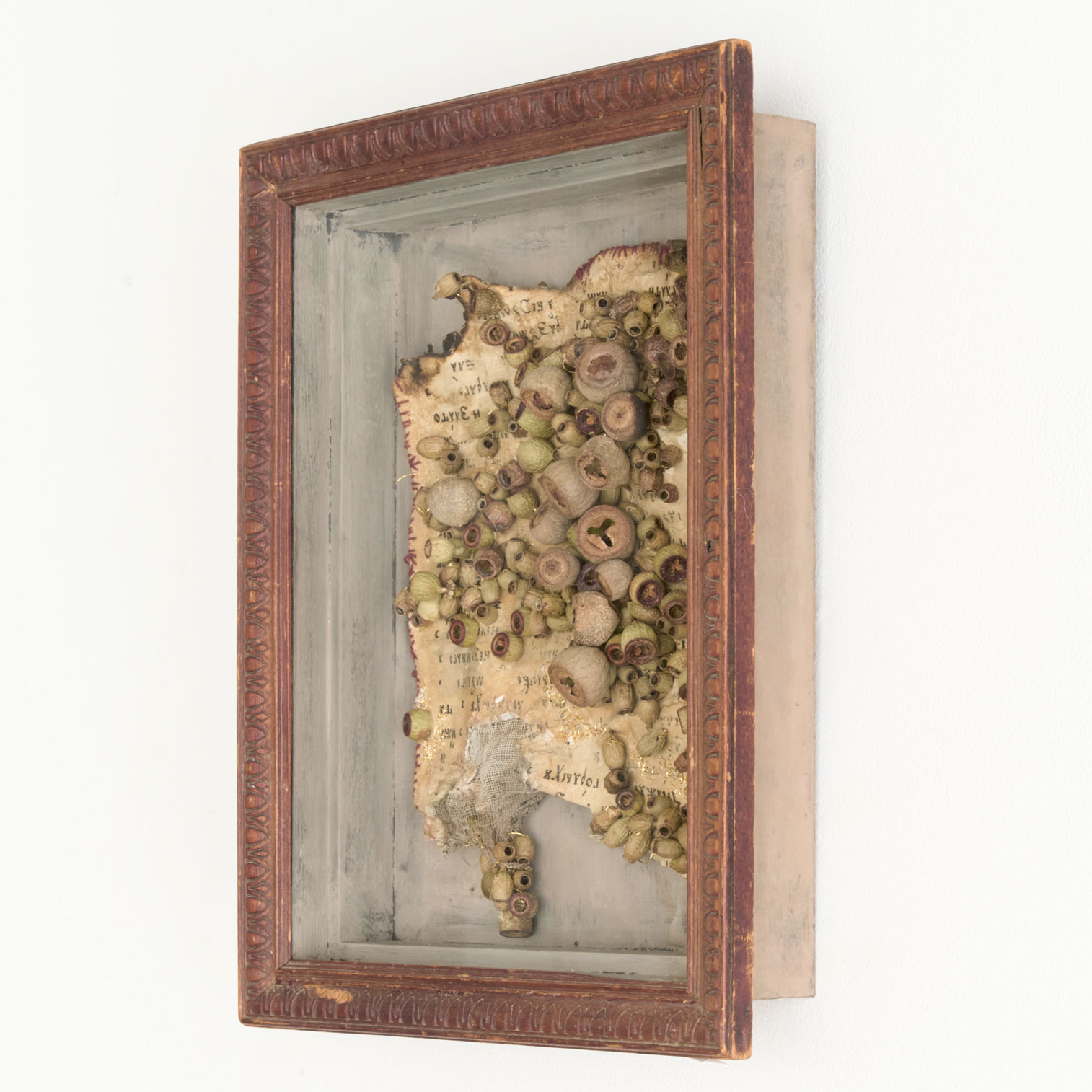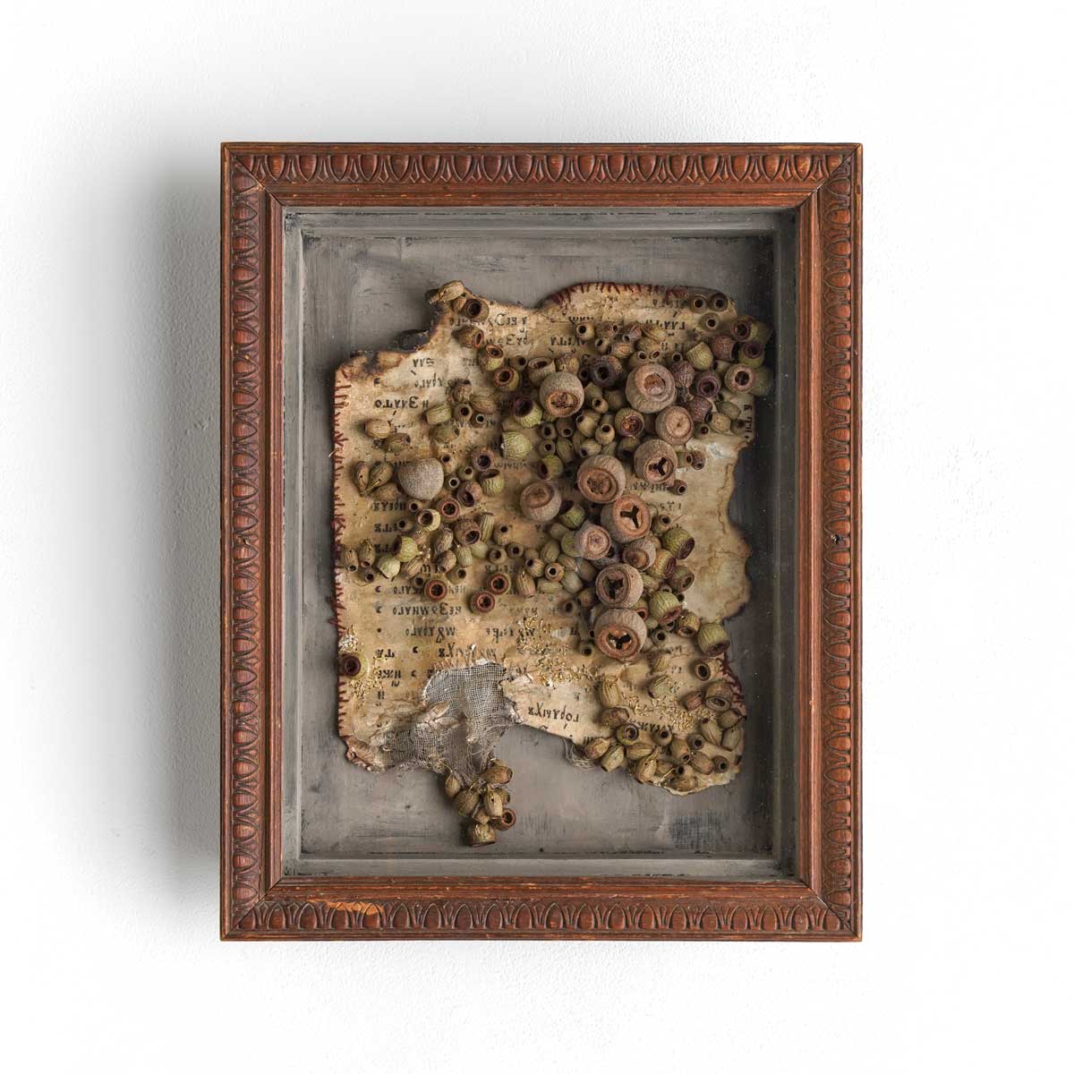 古い物語に植物を縫い重ねることで、新たな物語のはじまりをかたちにした作品です。ロシアの古書に、数種類のユーカリの実を用いて制作しています。