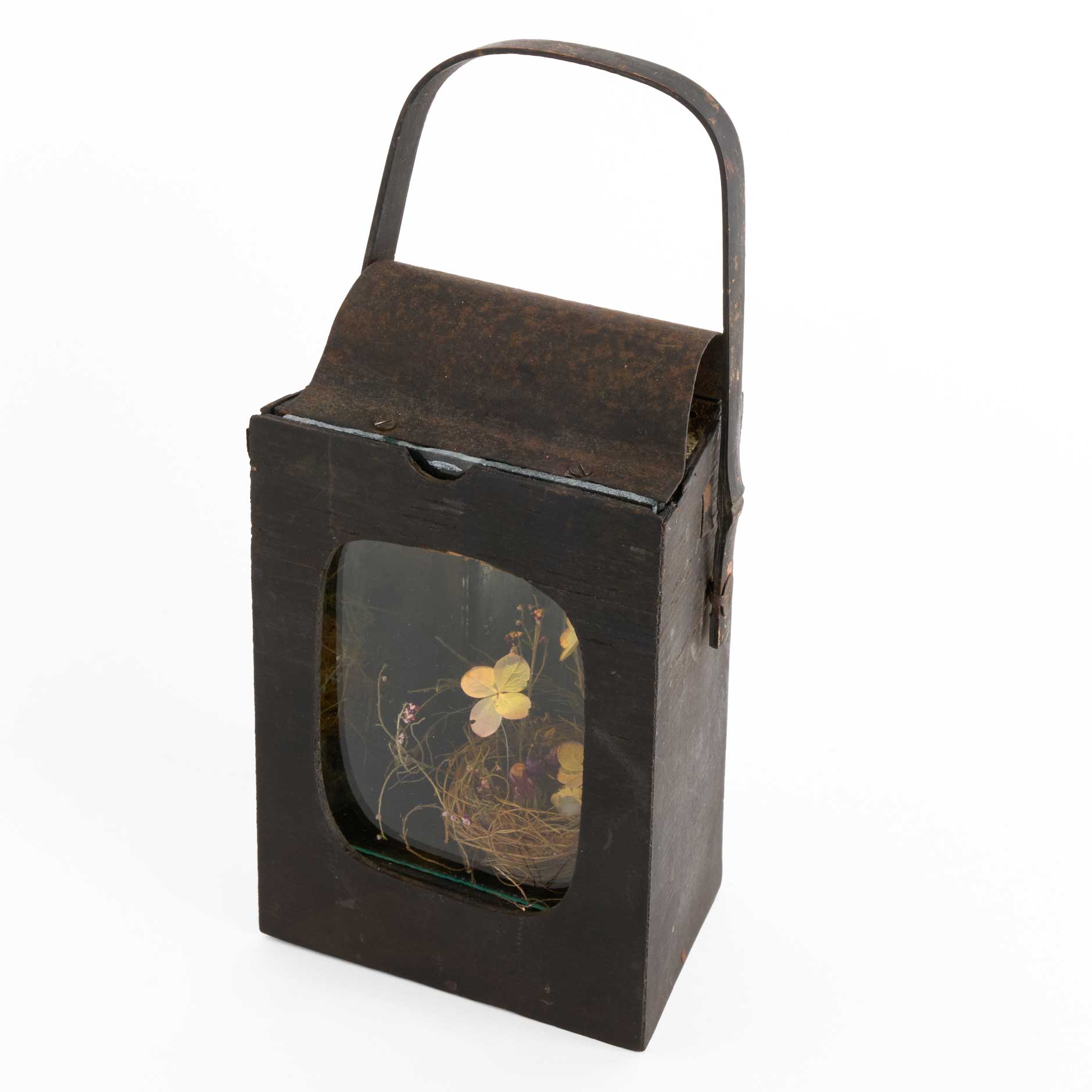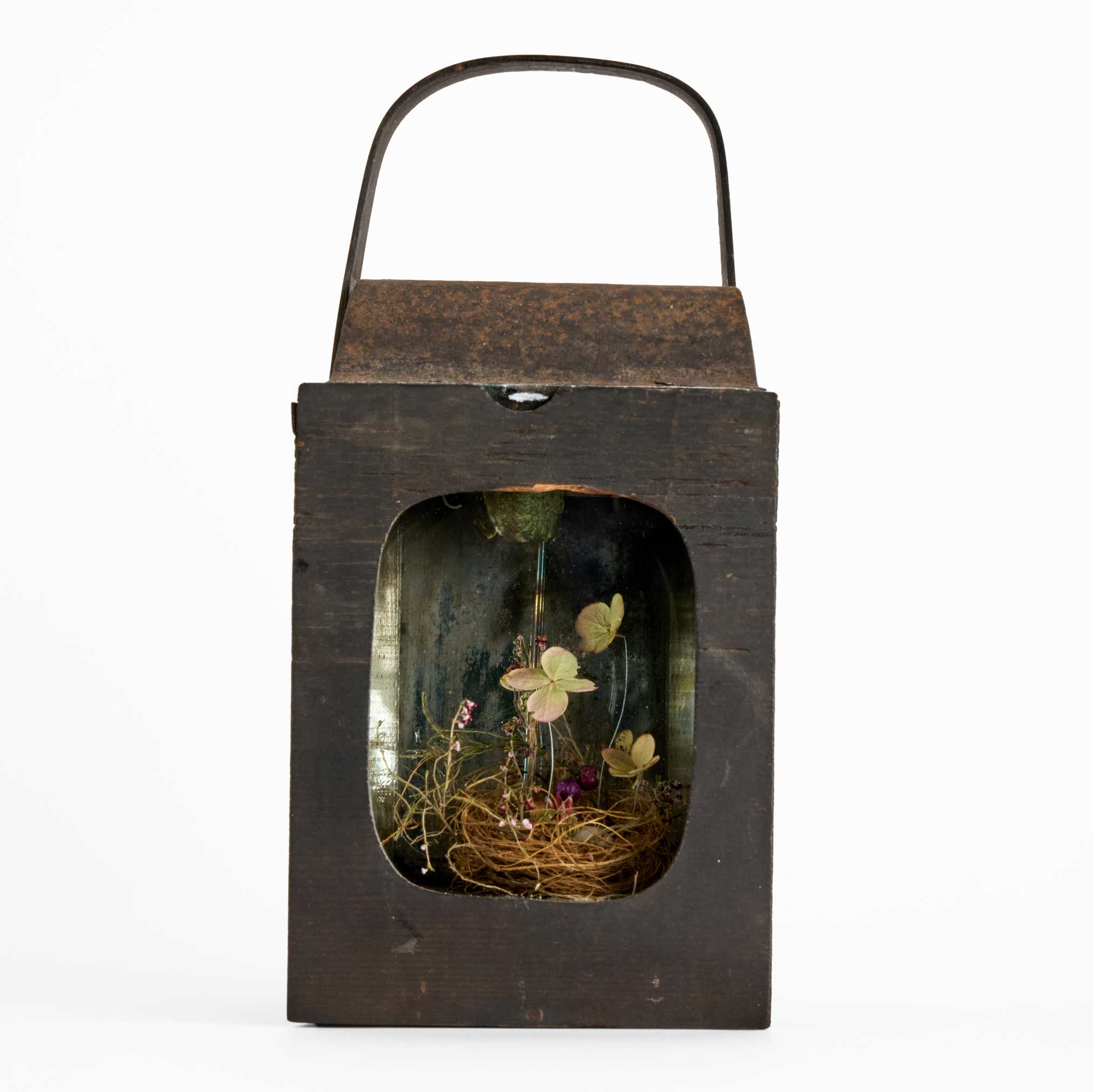 古物と植物を組み合わせ、不思議な世界への想像をかき立てるような作品に仕立てました。日本の古いカンテラを用い、その形や魅力をできるだけそのままに、新たな作品へと仕立てました。