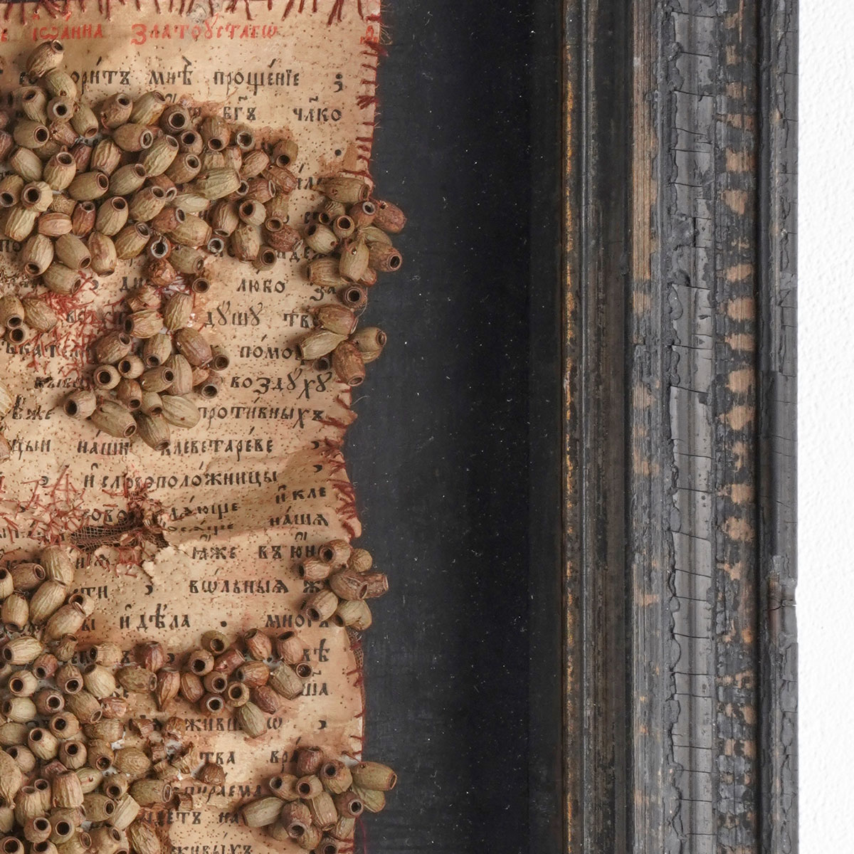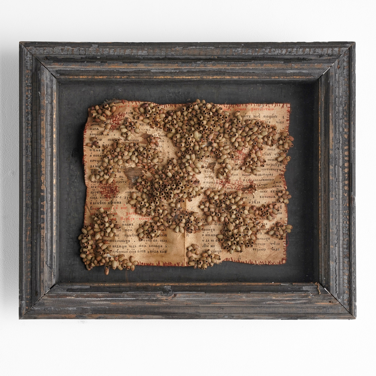 A work that gives rise to a new story by stitching plants onto an old narrative.Eucalyptus seeds are delicately sewn onto the pages of a Russian antique book to create this piece.
