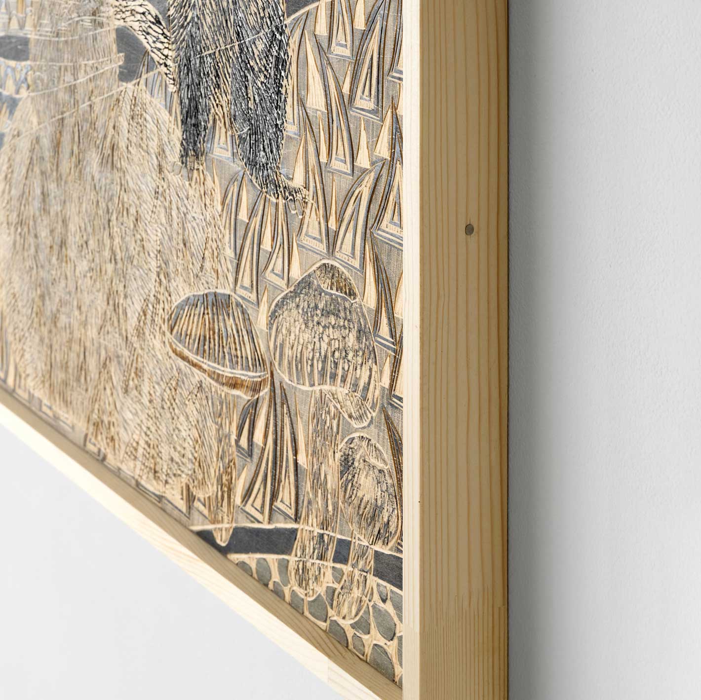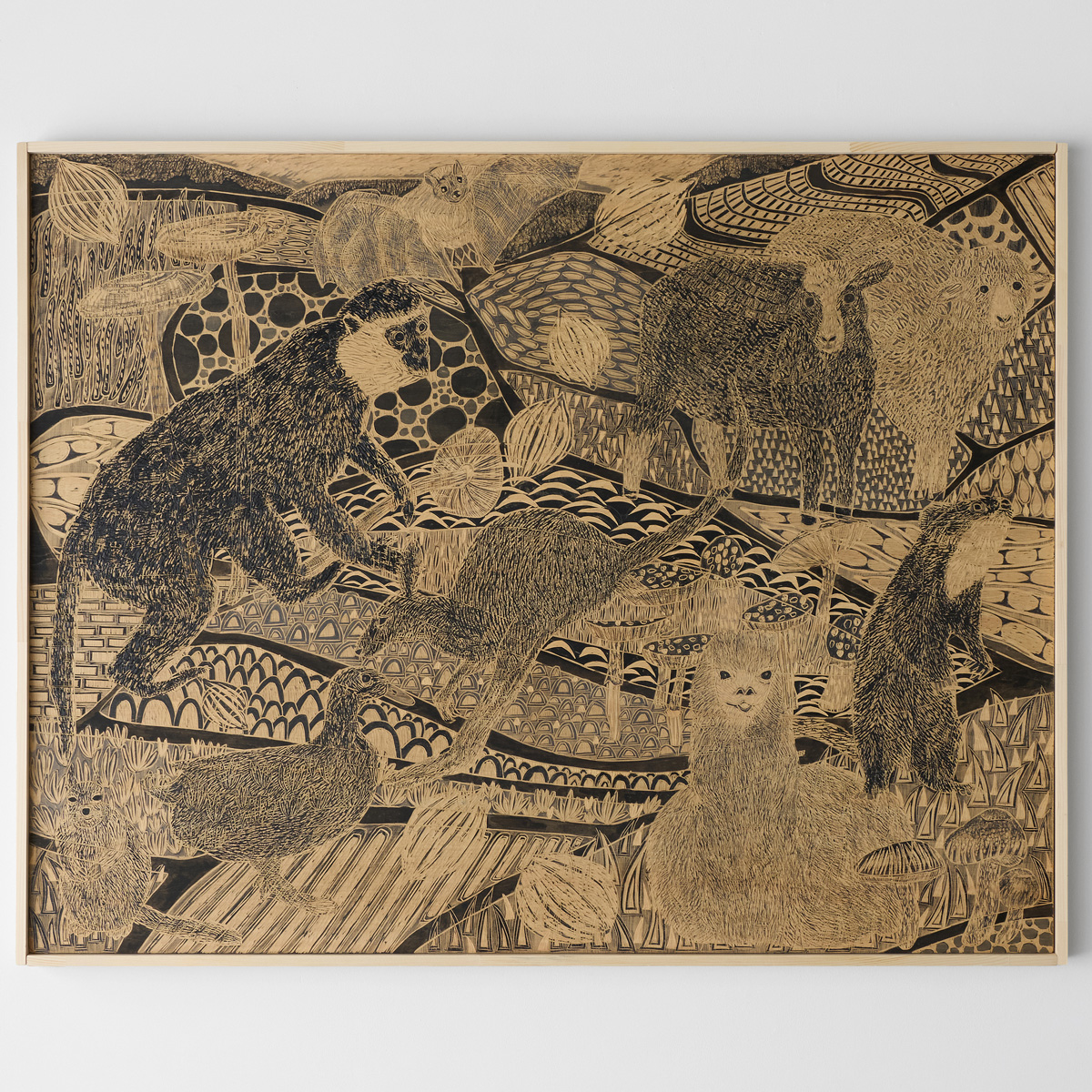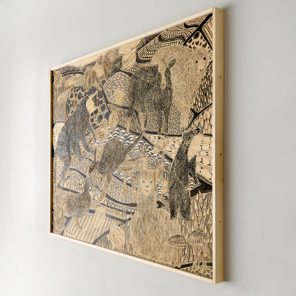 This work draws inspiration from traditional woodblock printing, employing a unique technique in which the artist sketches directly onto a wooden board and then carves the image using woodcutting tools. The composition is filled with animals rendered across the entire surface, and through meticulous carving, the piece emanates a gentle yet powerful vitality, capturing both warmth and energy.
