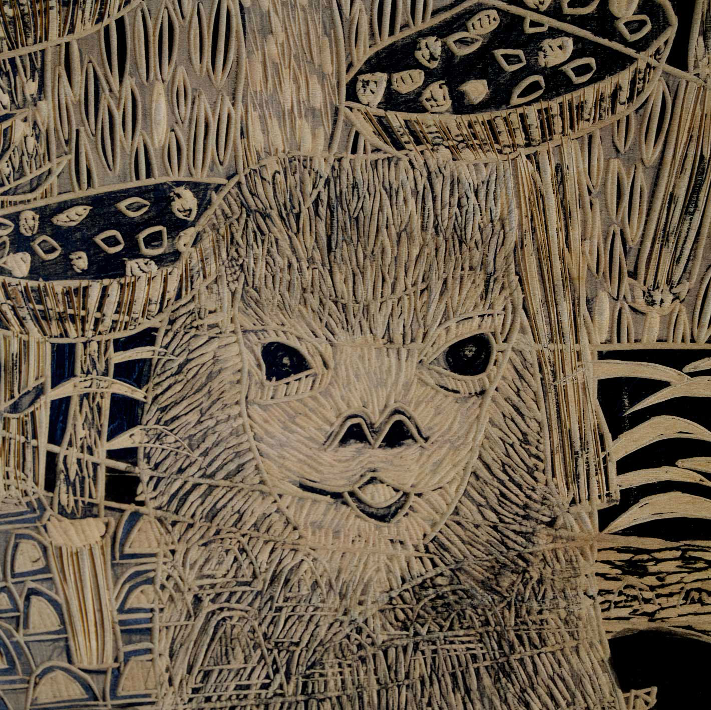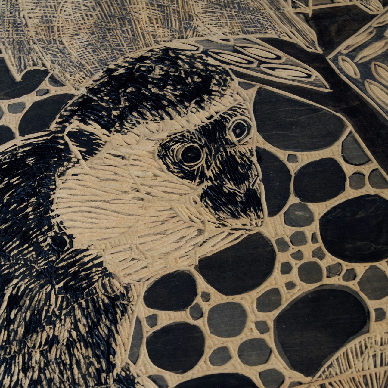木版画から構想を得て、板に描画して彫刻刀で彫るという方法で制作した作品です。画面いっぱいに動物たちを描き、丁寧に掘り込むことで、生命力あふれる優しい迫力を持った作品に仕上げています。