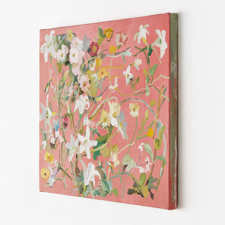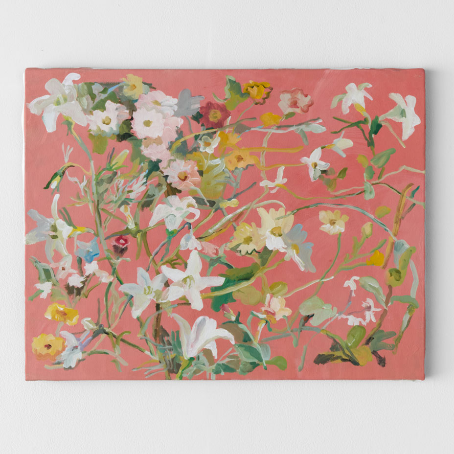 咲き乱れる花々を構成し、描いた作品。背景のピンクと花々の構成が、華やかで美しいです。キャンバスにアクリル絵の具で描かれています。
