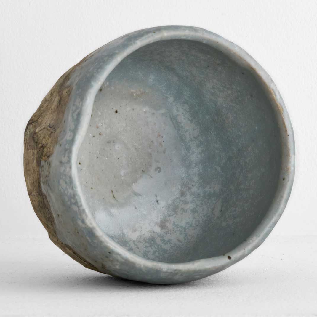 This tea bowl combines the earthy texture of clay with a soft blue glaze, embodying both strength and delicacy. Its comfortable weight and stability make it practical to use while also offering aesthetic beauty. The unique surface, born from long hours of firing, adds to its distinctive charm.