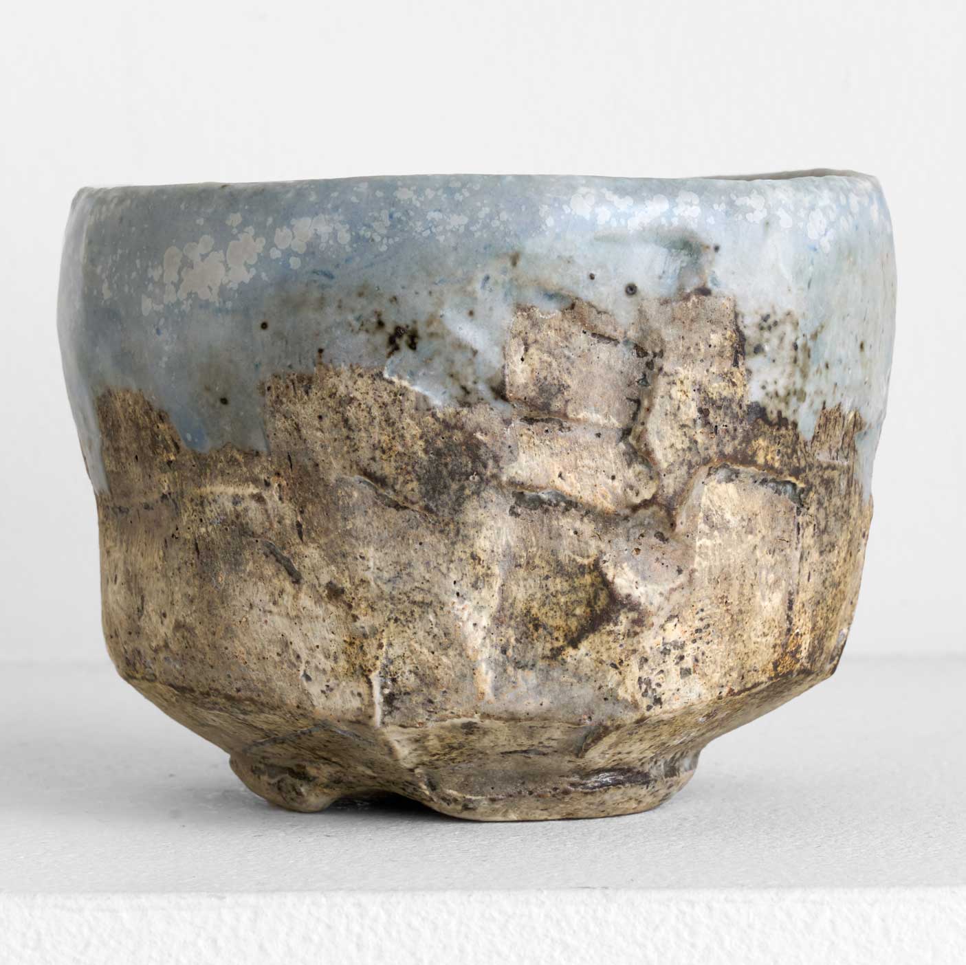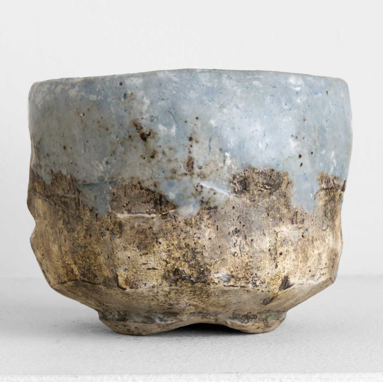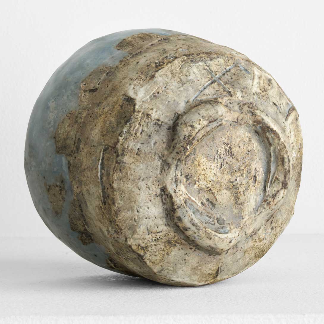 土の質感と青い釉薬、力強さと繊細さを併せ持つ抹茶碗です。手に馴染む程よい重みと安定感があり、実用性と美しさを兼ね備えています。長時間焼成によって生み出された質感も魅力です。
