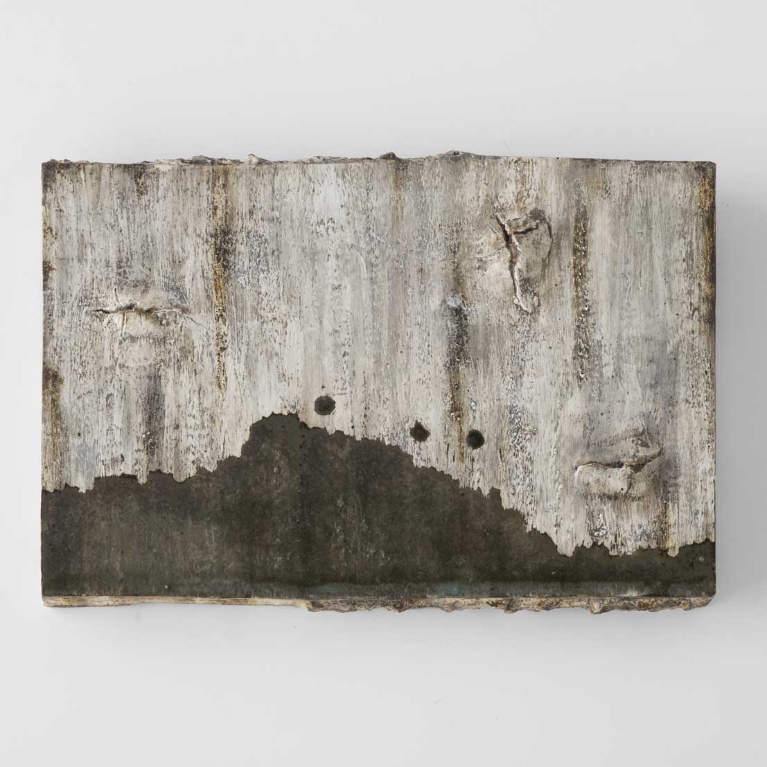 This is a slab-like object evoking the scene of rain falling on the earth. It can also be used as a plate. Layers of different types of clay are carefully applied, and through a meticulous process of prolonged firing, the resulting colors and surface qualities highlight both the inherent strength of the material and its serene beauty.