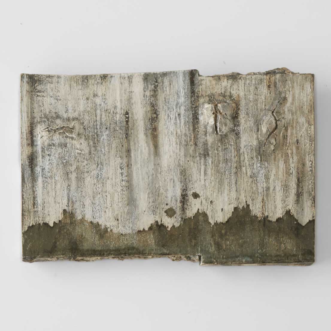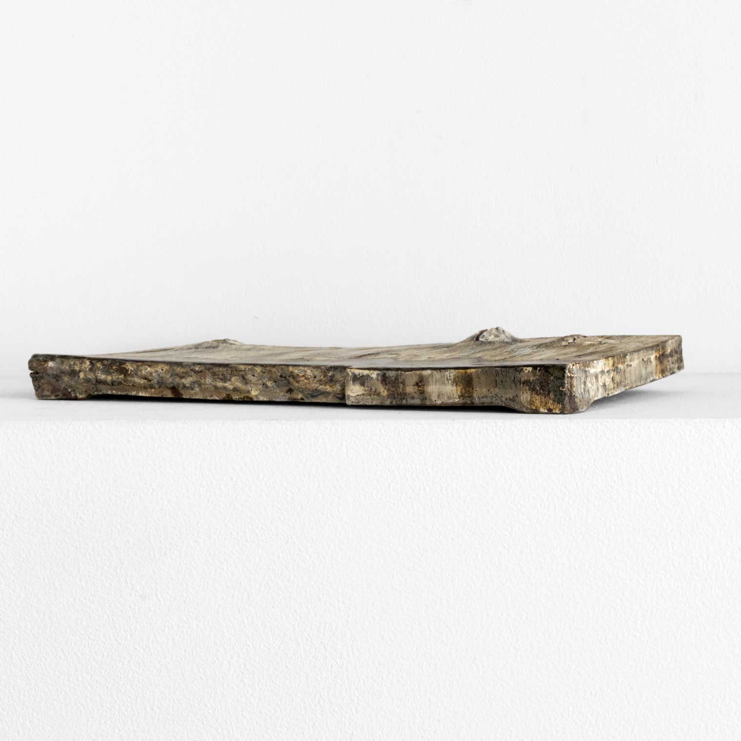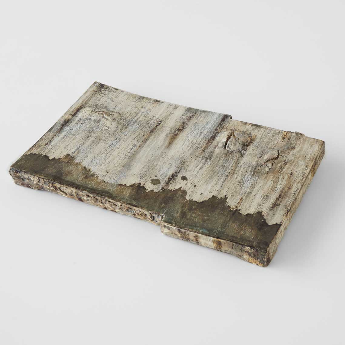 大地に雨が降り注ぐ情景を思わせるような板状のオブジェです。板皿としてもご使用いただけます。異なる種類の土を幾重にも塗り重ね、丹念な工程を経て長時間焼成によって引き出された色合いや肌合いが、素材そのものの力強さと静かな美しさを引き立てています。