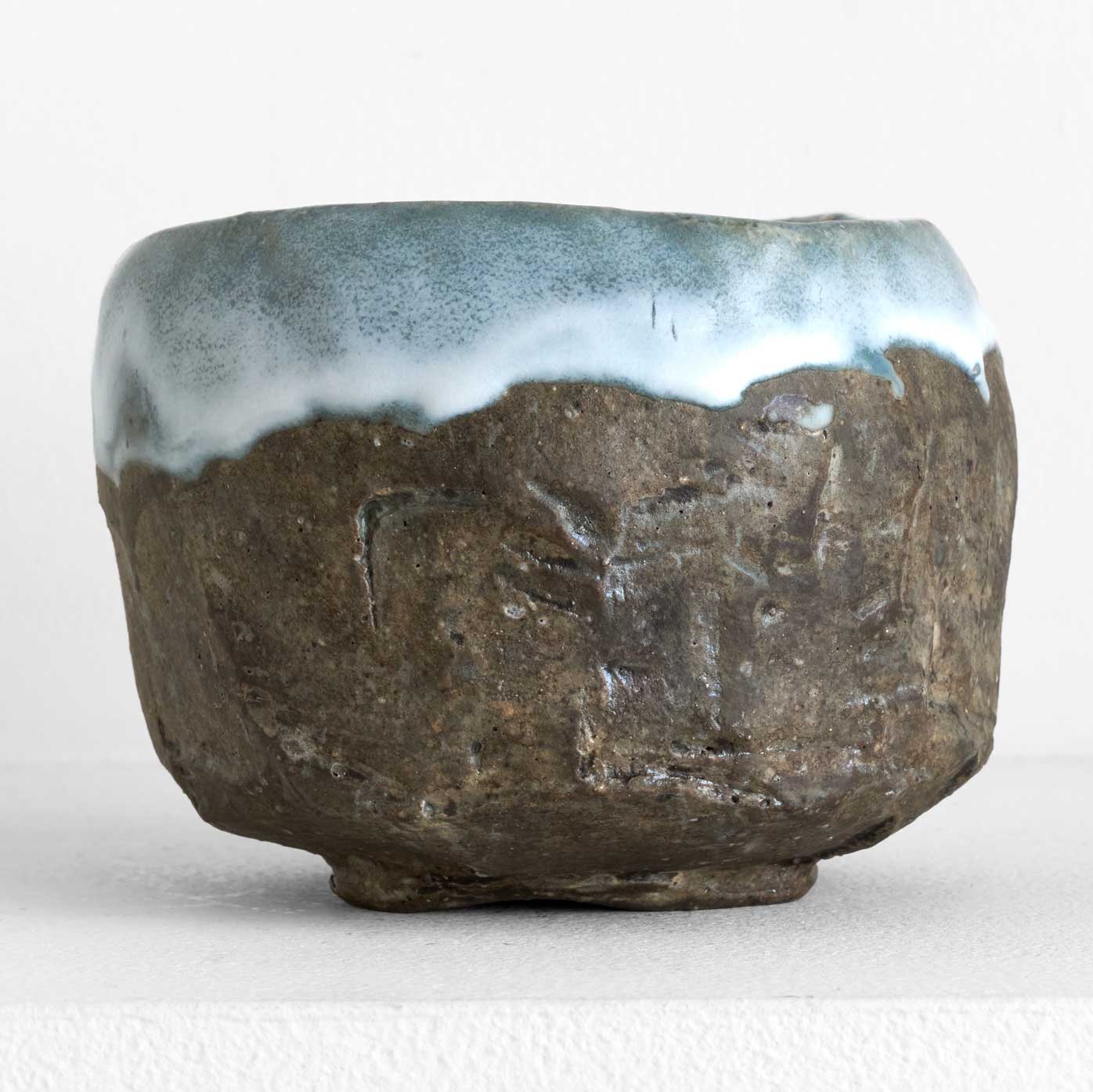 土の力強さを感じさせる素地の上に、澄んだ青白色の釉が流れ落ちるように掛かった抹茶椀です。