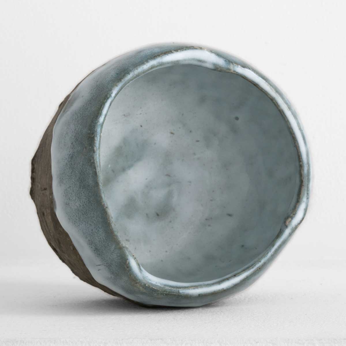 This is a matcha bowl in which a clear bluish-white glaze flows over a base that emphasizes the strength of the clay. The contrast between the clay’s rough texture and the smooth expression of the glaze, along with its comfortable weight and stability in the hand, combines both practicality and beauty.