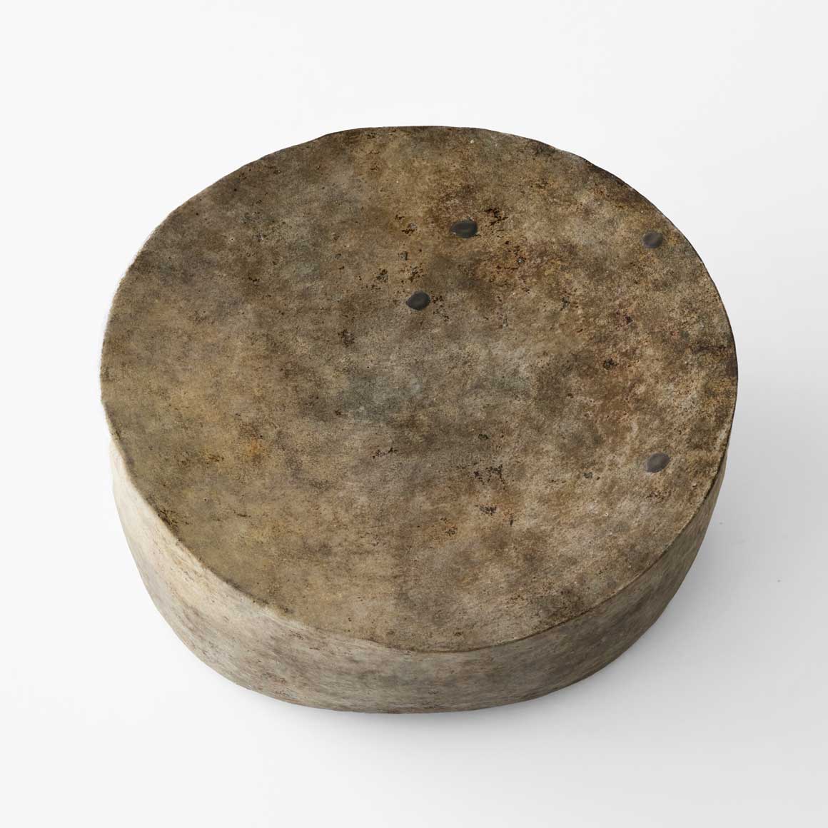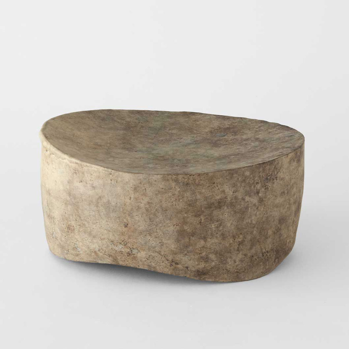 重厚な土の表情が際立つ、天面に雨水を湛えるような窪みをもつ円筒状のオブジェです。異なる種類の土を幾重にも塗り重ね、丹念な工程を経て長時間焼成によって引き出された色合いや肌合いが、素材そのものの力強さと静かな美しさを引き立てています。