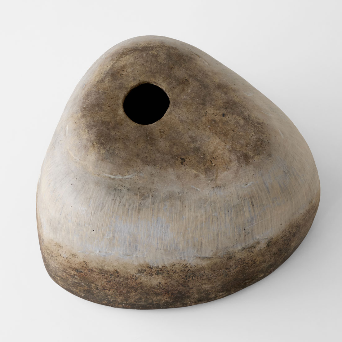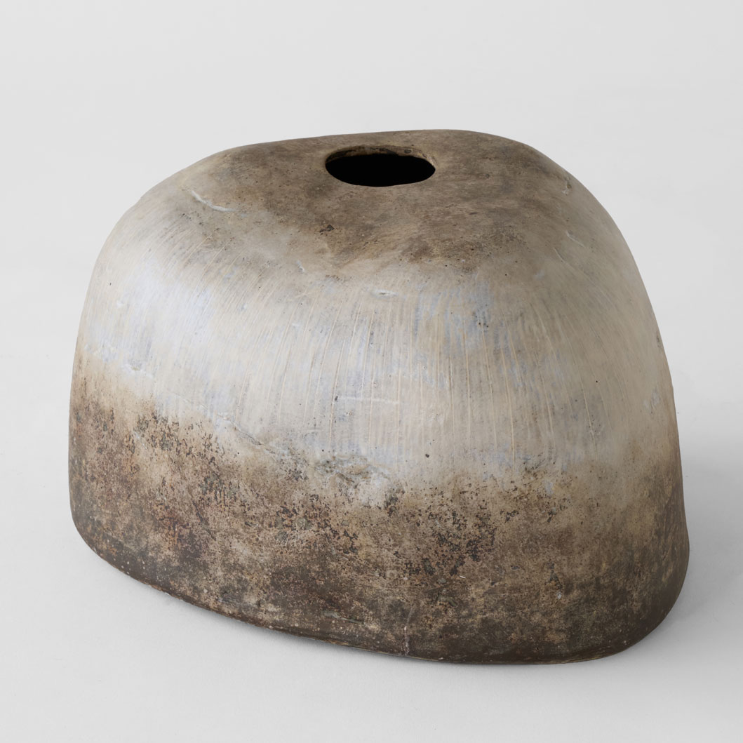 やわらかな丸みを帯びた独特のシルエットが印象的なオブジェです。表面には、雨が降りそそぐ光景を思わせる繊細なグラデーションが広がり、光の加減や見る角度によって多彩な表情を見せます。異なる種類の土を幾重にも重ね、長時間かけて焼成することで生まれた質感も大きな魅力です。花器としてご使用の場合は、落としをご利用ください。