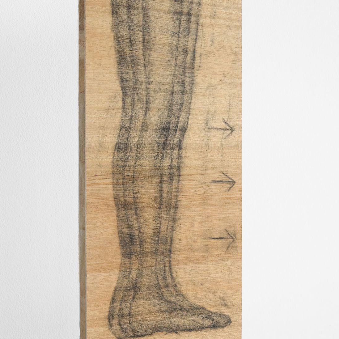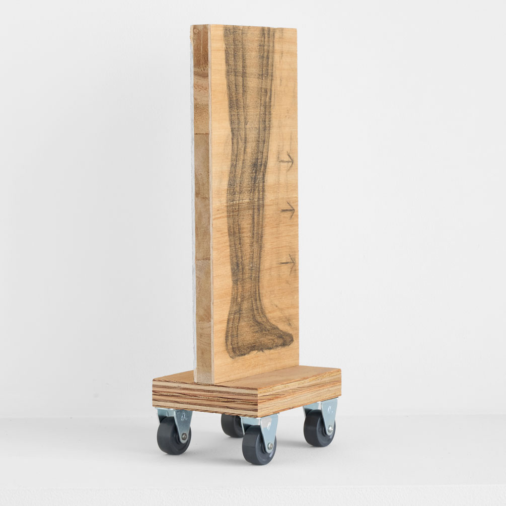 A foot is drawn in charcoal on a wooden panel.Small wheels are attached, allowing it to move.