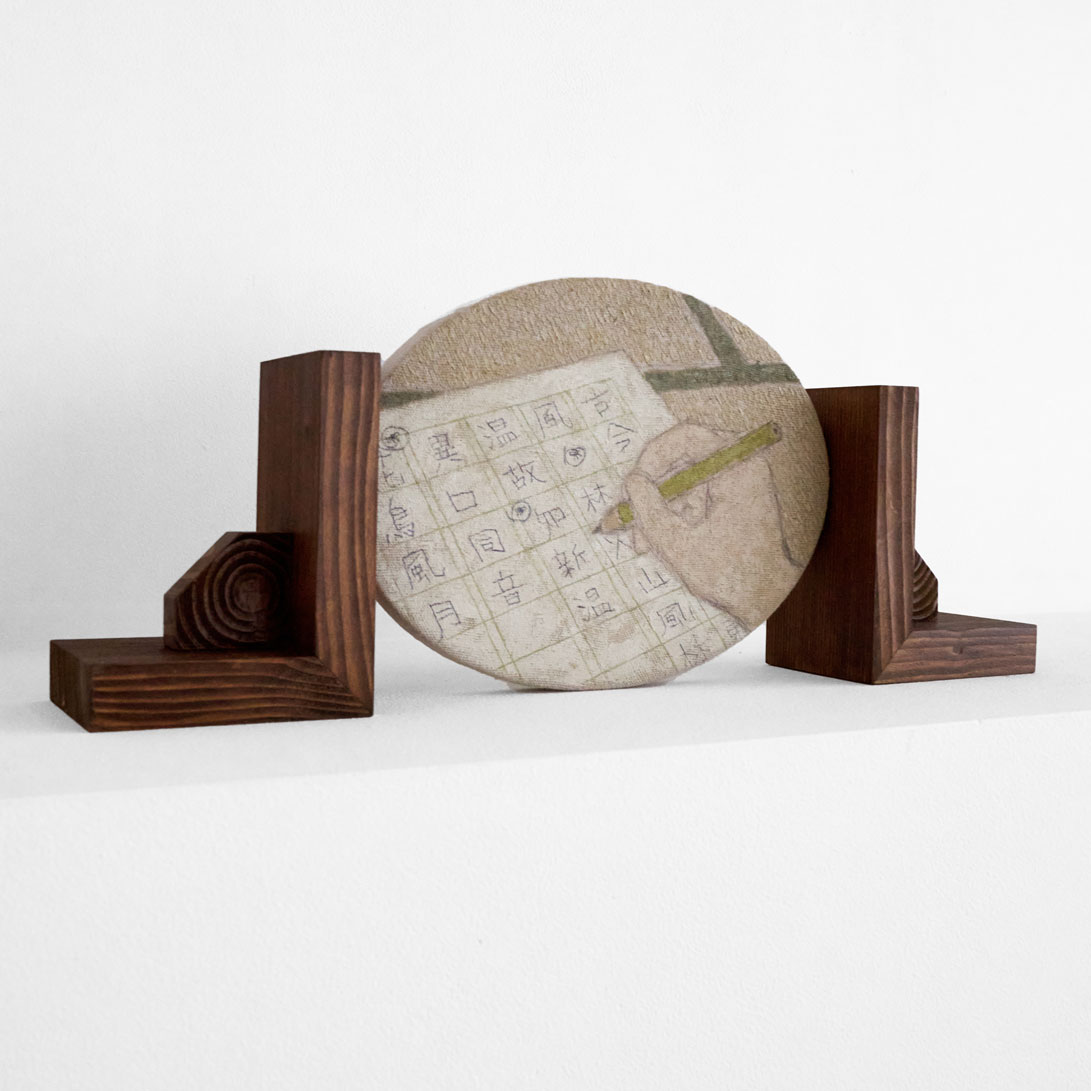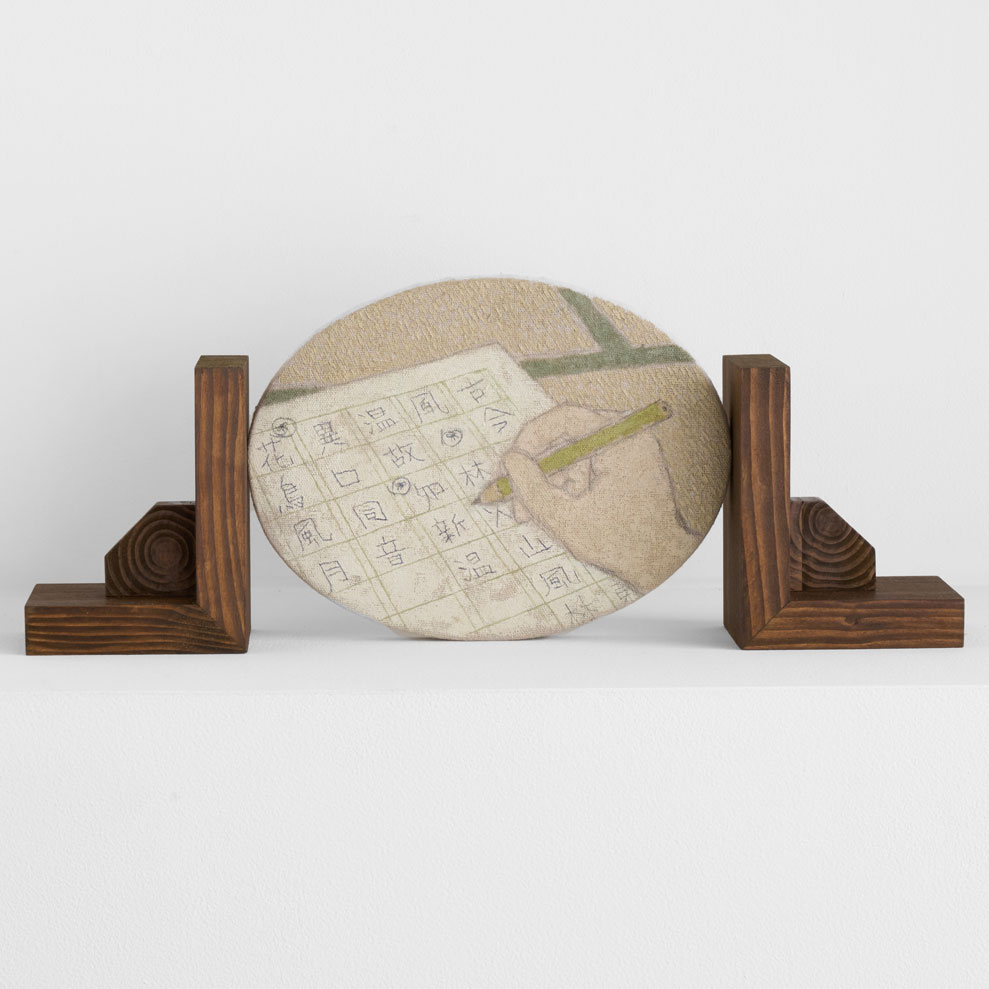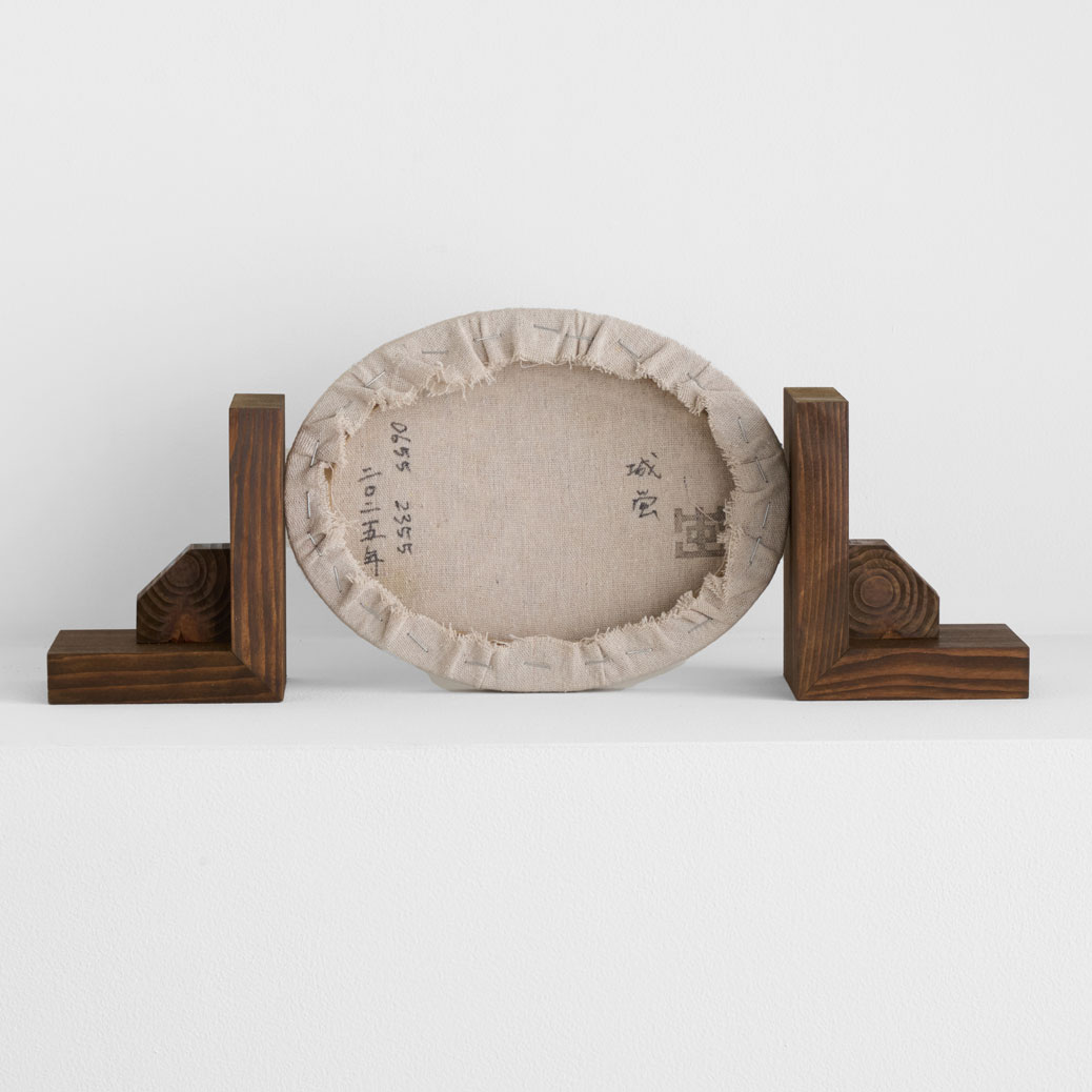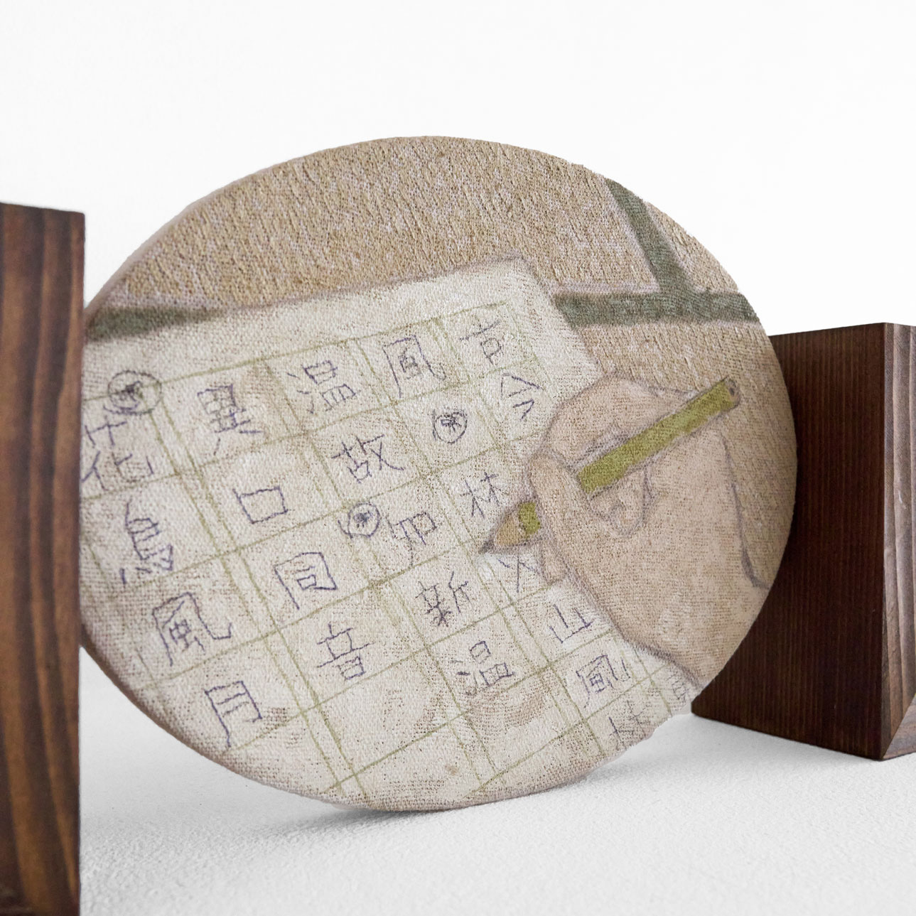 楕円の画面に描かれた、手習の様子。両サイドから挟み込む形での台座がつけられています。キャンバスと木材は取り外し可能です。