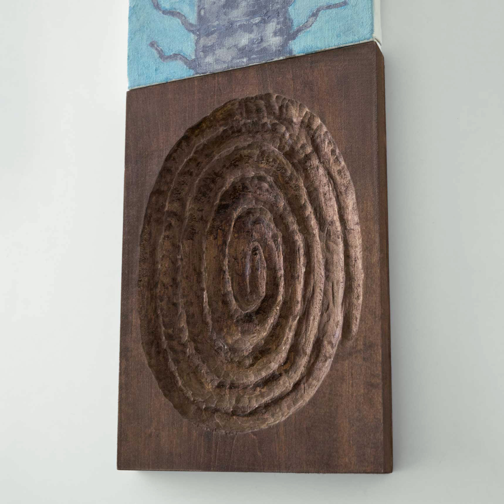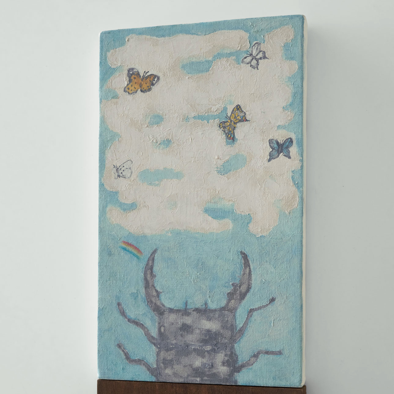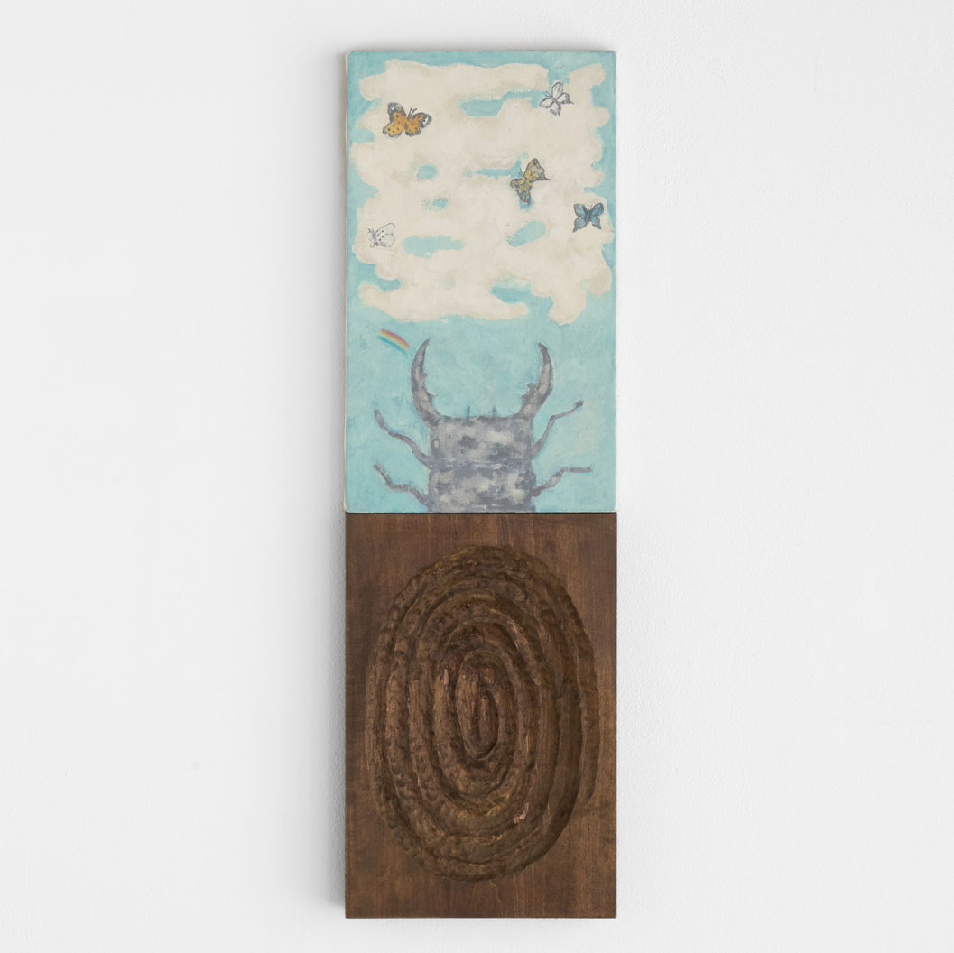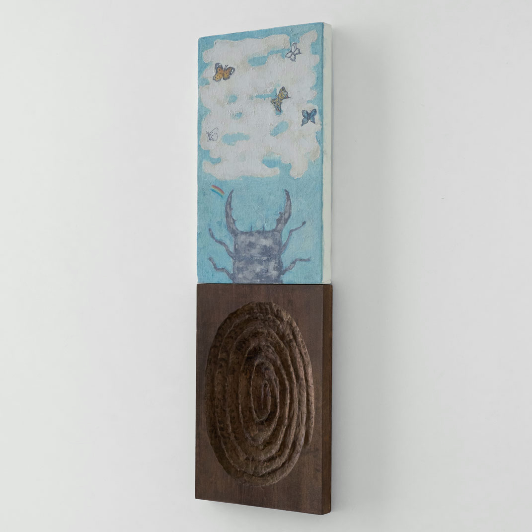 キャンバスと木彫を組み合わせた作品。空と昆虫、大地、自然の理を感じます。