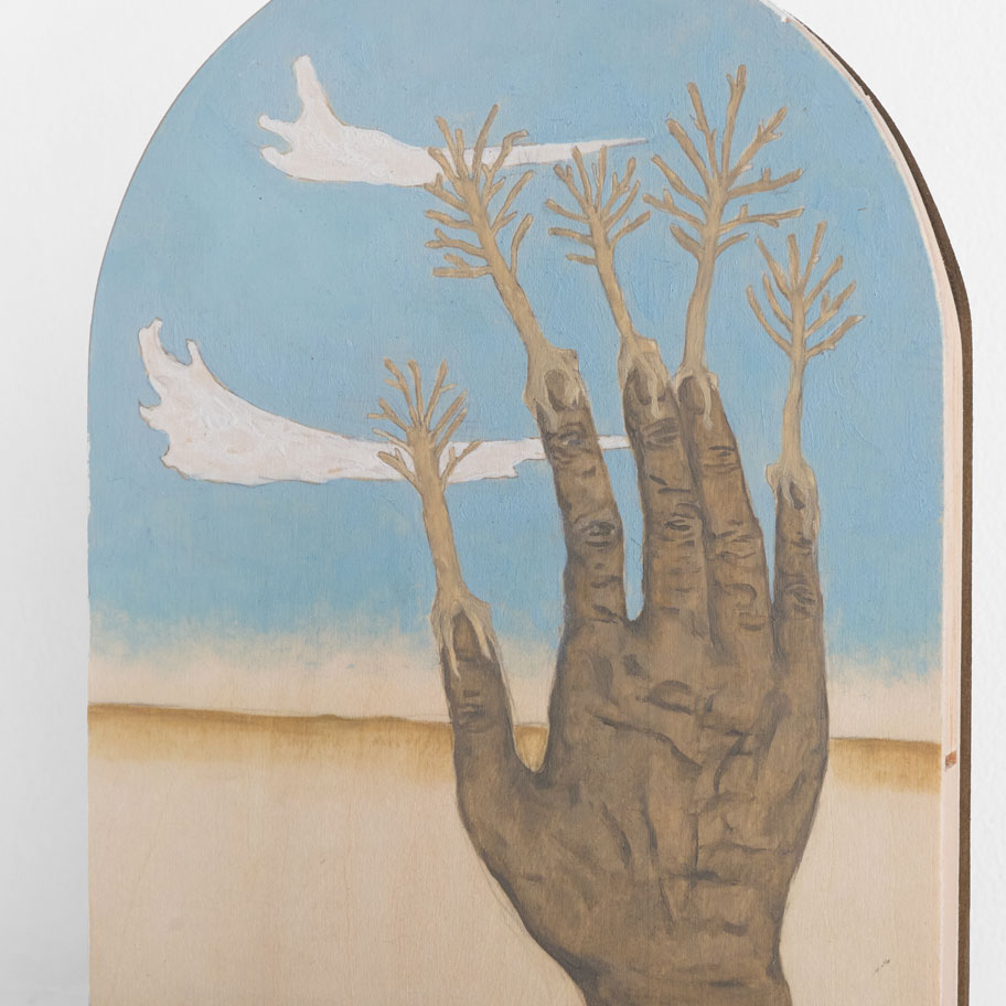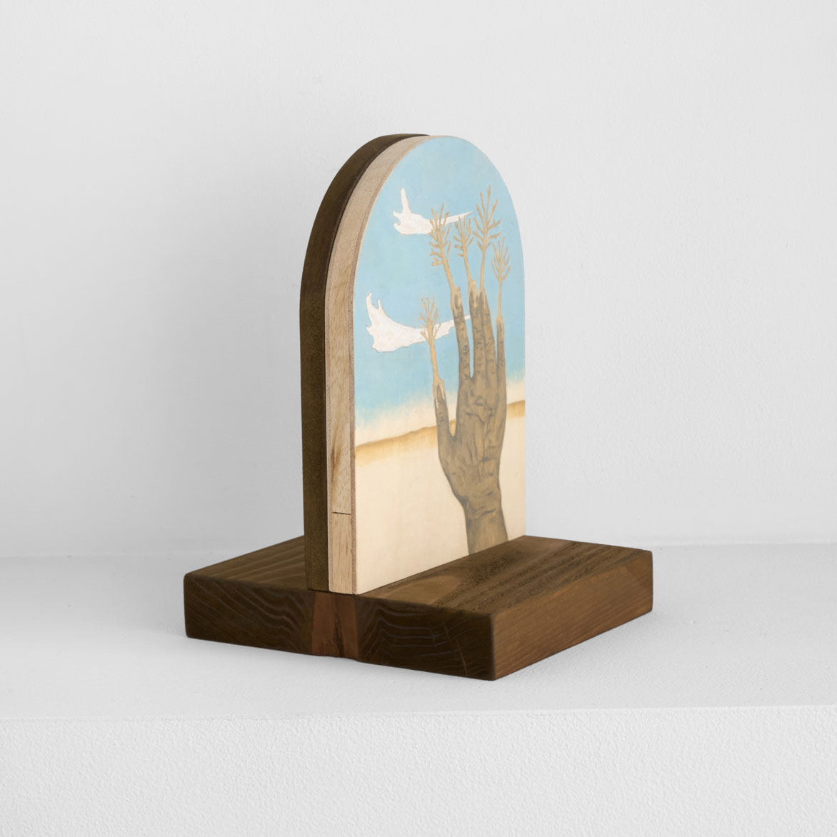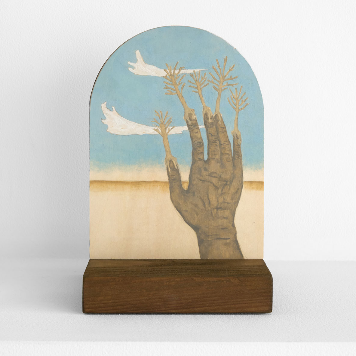 アーチ型に切り取られた画面に青空と枝の生えた手が描かれています。台座があり自立する作品です。