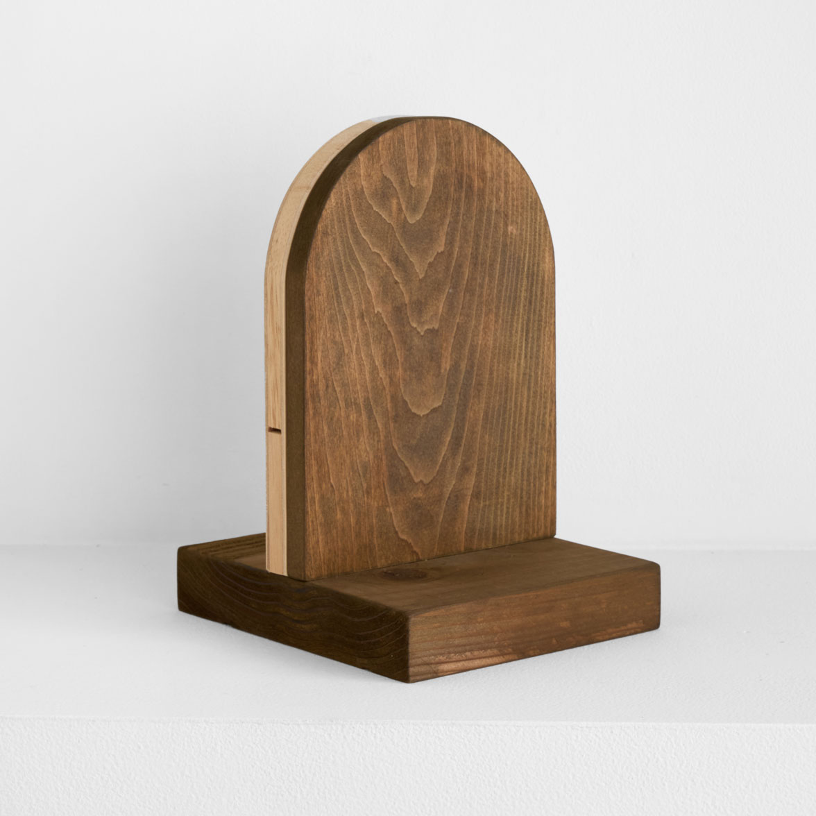 An arched panel depicts a blue sky and a hand from which branches grow.The work stands independently with its own base.