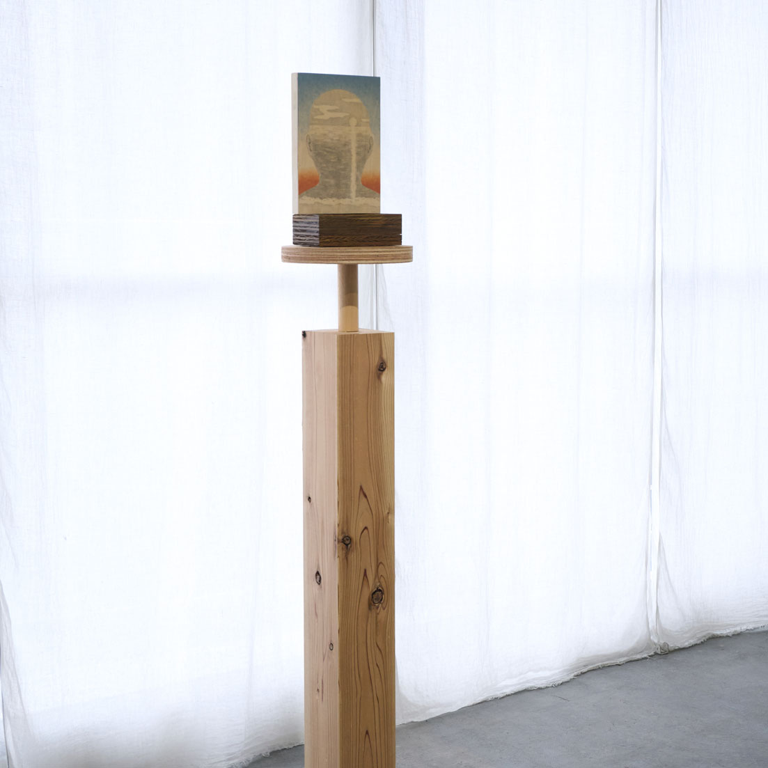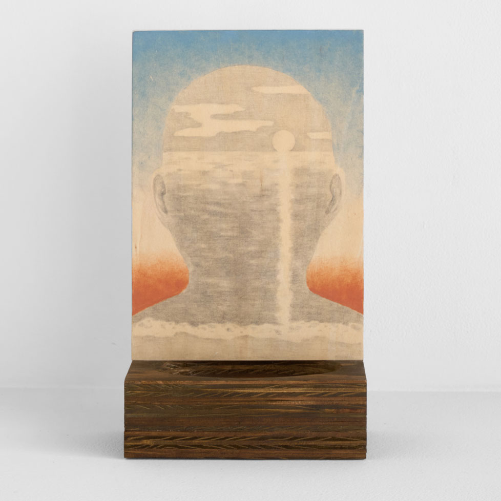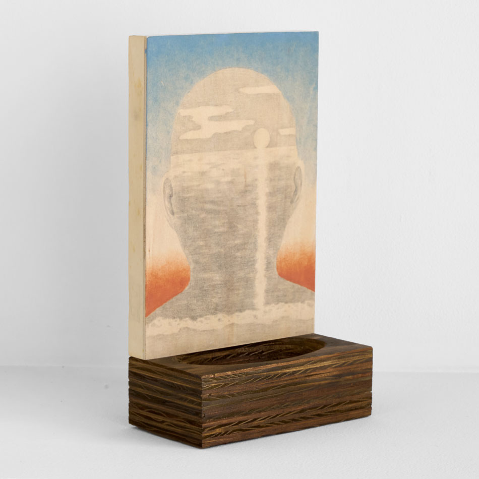 A work depicting the sky, cut in the shape of a sunset and a human head.Two skies overlap, filling the small panel with their imagery.The piece is self-standing, supported by its own base.Message from the artist: