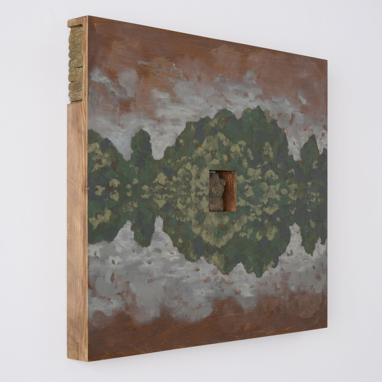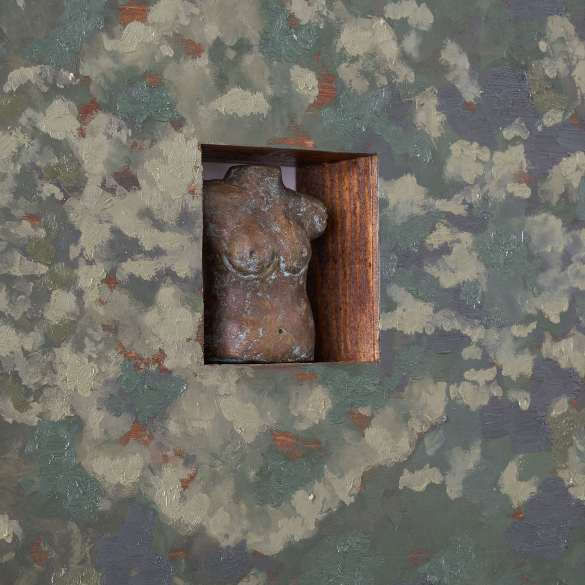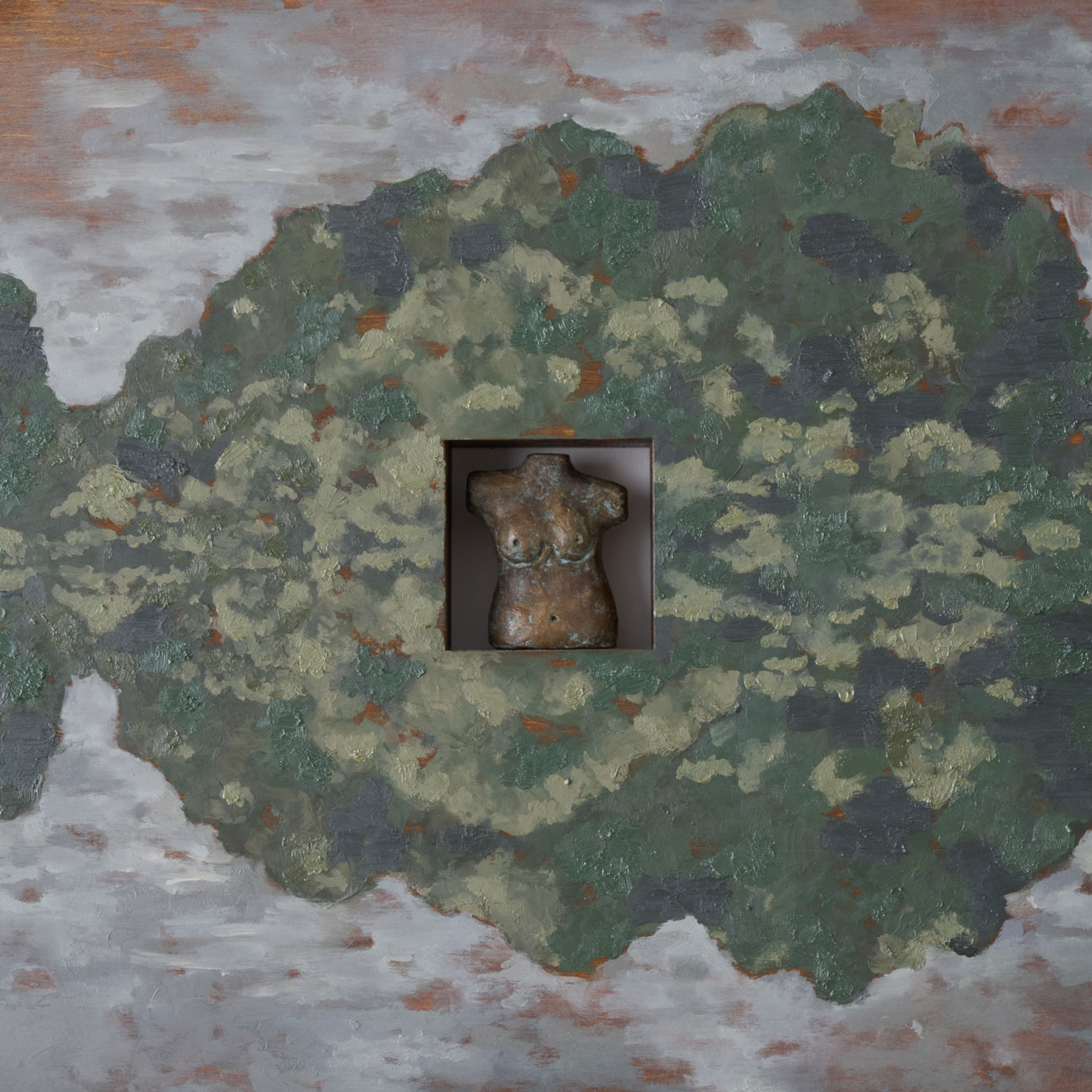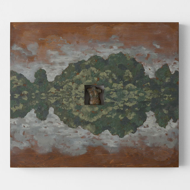 A female torso is set into a square cutout at the center of the panel.The work depicts a landscape reflected on the water, though the boundary is ambiguous, evoking a strong sense of mystery.