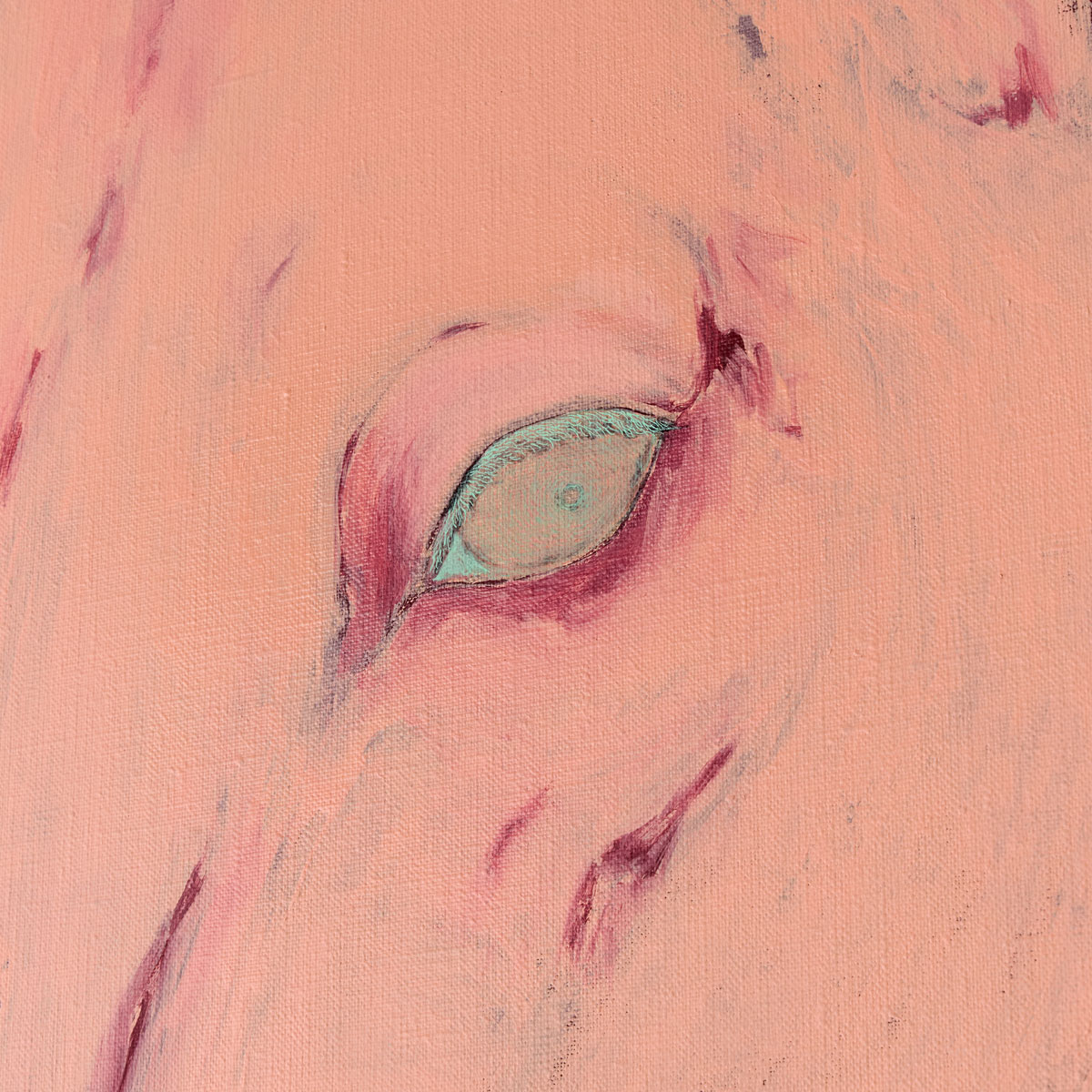 Tanaka themselves says they do not fully understand why they are drawn to horses. It is precisely this “lack of understanding” that drives them to create. In this striking work, a fleeting expression of a horse is captured with green eyes against a canvas of pink.