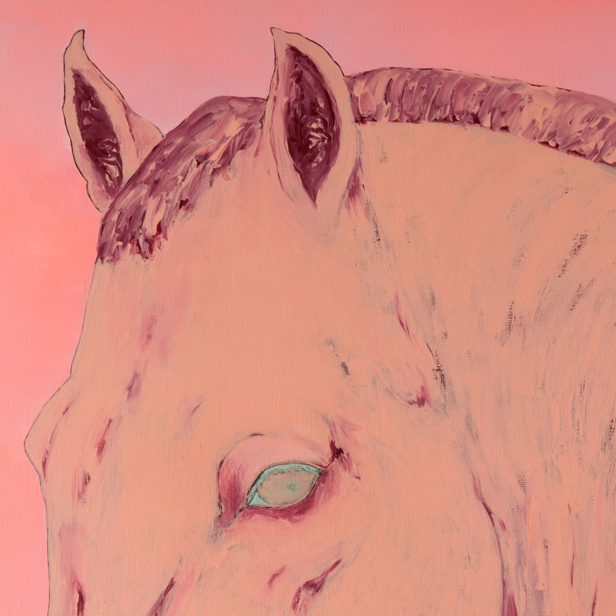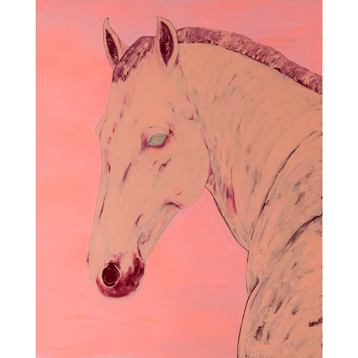 ピンク一色の画面の中に、馬の一瞬の表情をグリーンの瞳とともにとらえた、印象的な作品です。