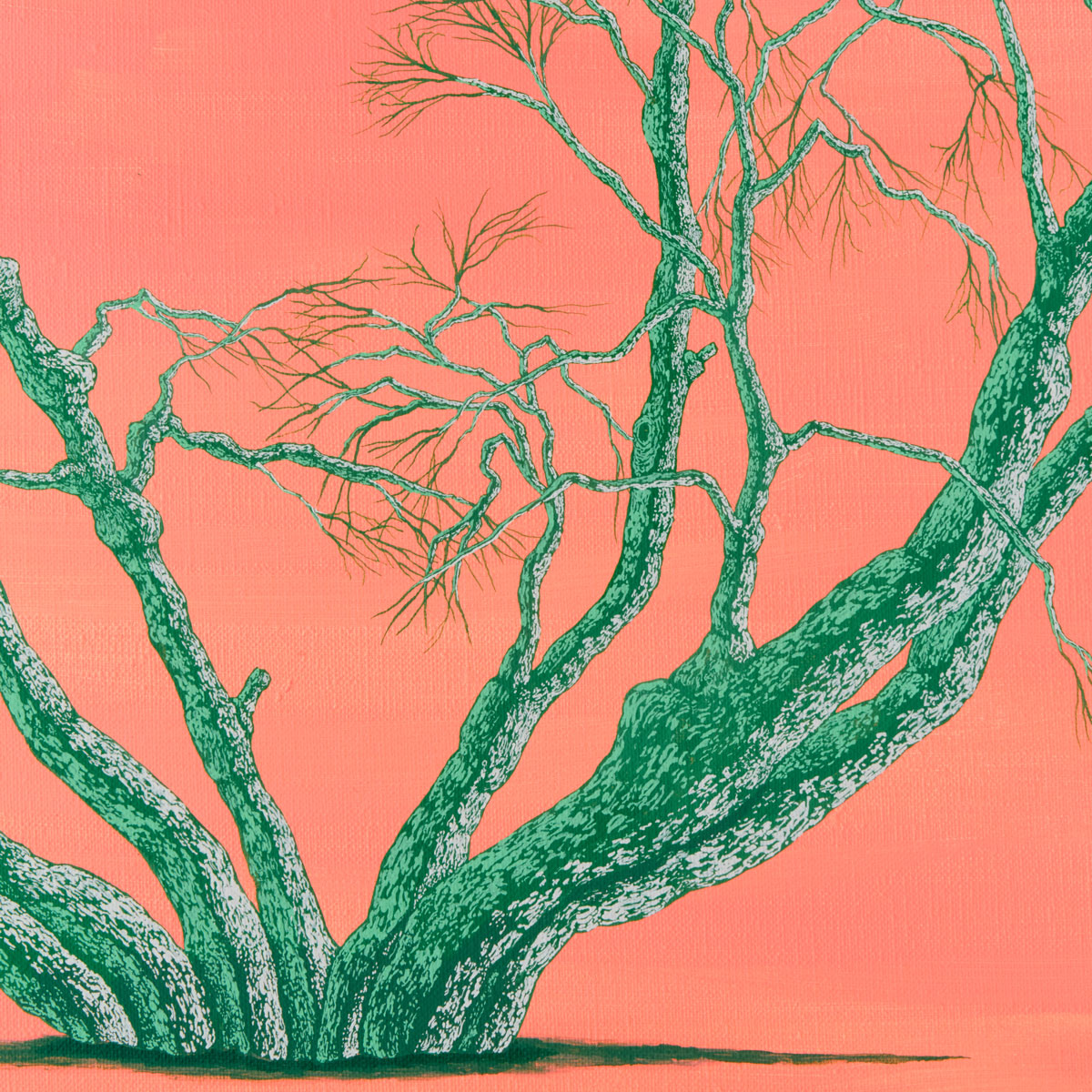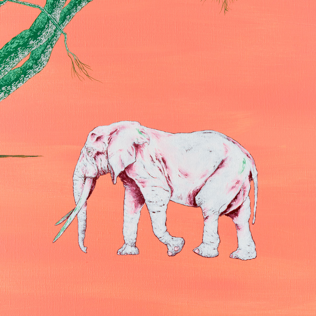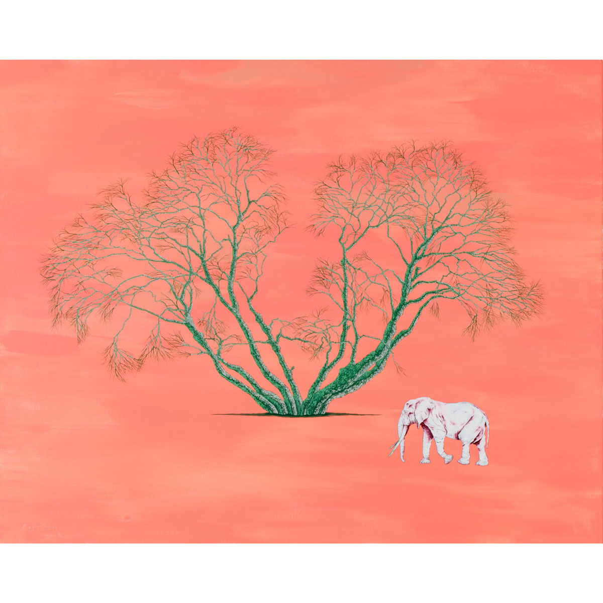 未来を見据え、限られた時間の中で自分に何ができるのか、何を成し遂げたいのかを問い続けながら制作された作品です。大きく枝を広げた大木と像が象徴的に描かれ、明るいピンクが希望を感じさせます。