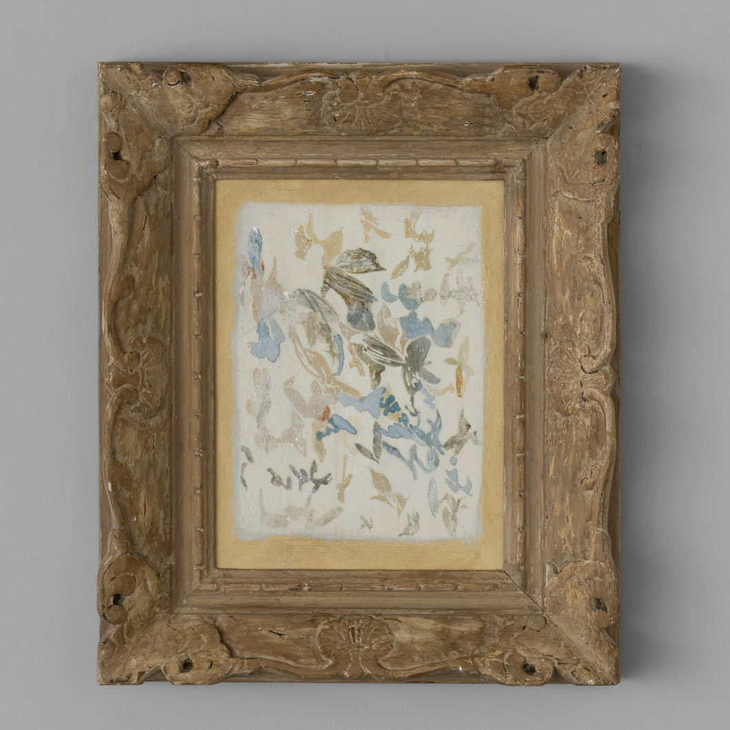 西洋から見た東洋的なイメージし、植物のパターンのような絵を描きました。骨董市で購入した額の塗装を剥がして額装しました。裏側の留め具はどっこ形式ですが、後付けで紐形式にも変更できます。