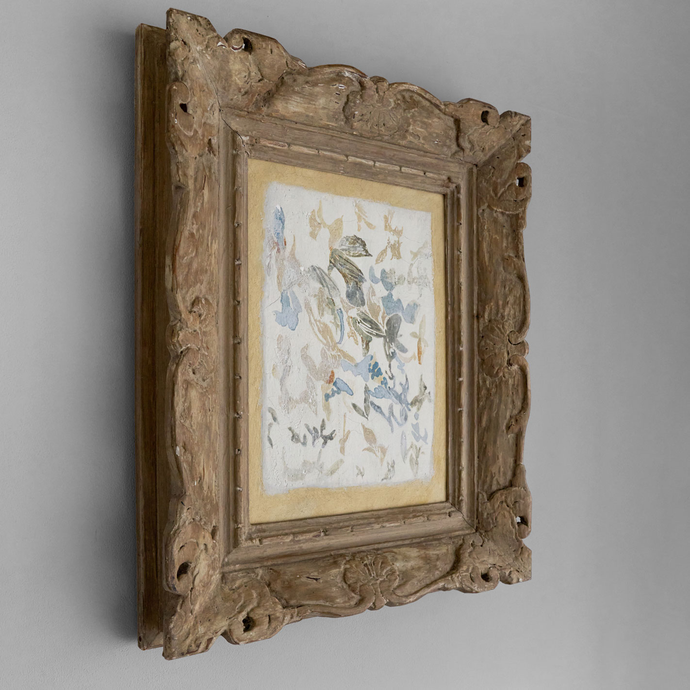 The frame, purchased at an antique market, was stripped of its original paint before framing the piece.The fixture on the back is a dokko type, a traditional Japanese peg used for hanging objects, but it can also be converted to a string hanging system if desired.