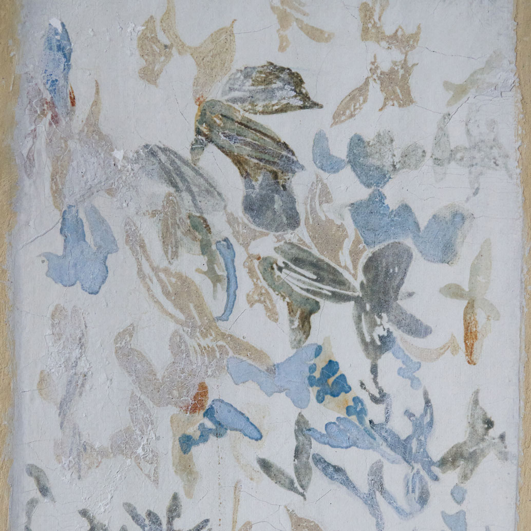 Thin ceramic panels, as delicate as paper, are painted with collected clay and cobalt oxide, and affixed onto a plaster base.