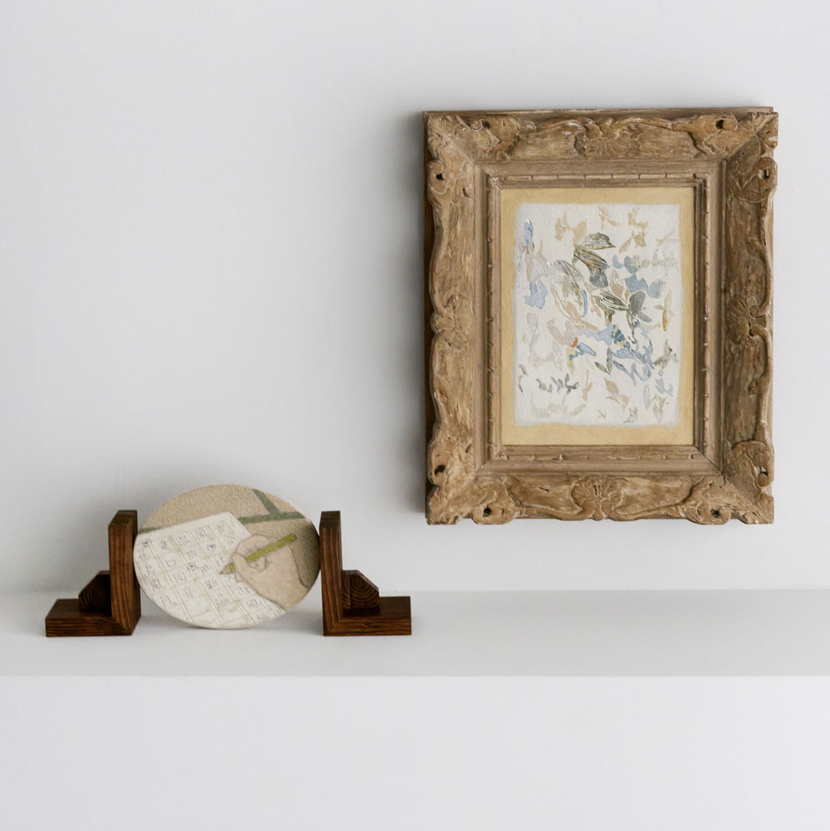 「割れ」や「欠け」という陶の特徴を活かした壁掛け作品です。採取した土や呉須でを絵付した、紙ぐらい薄い陶板画を漆喰のベースの上に貼り込んでいます。