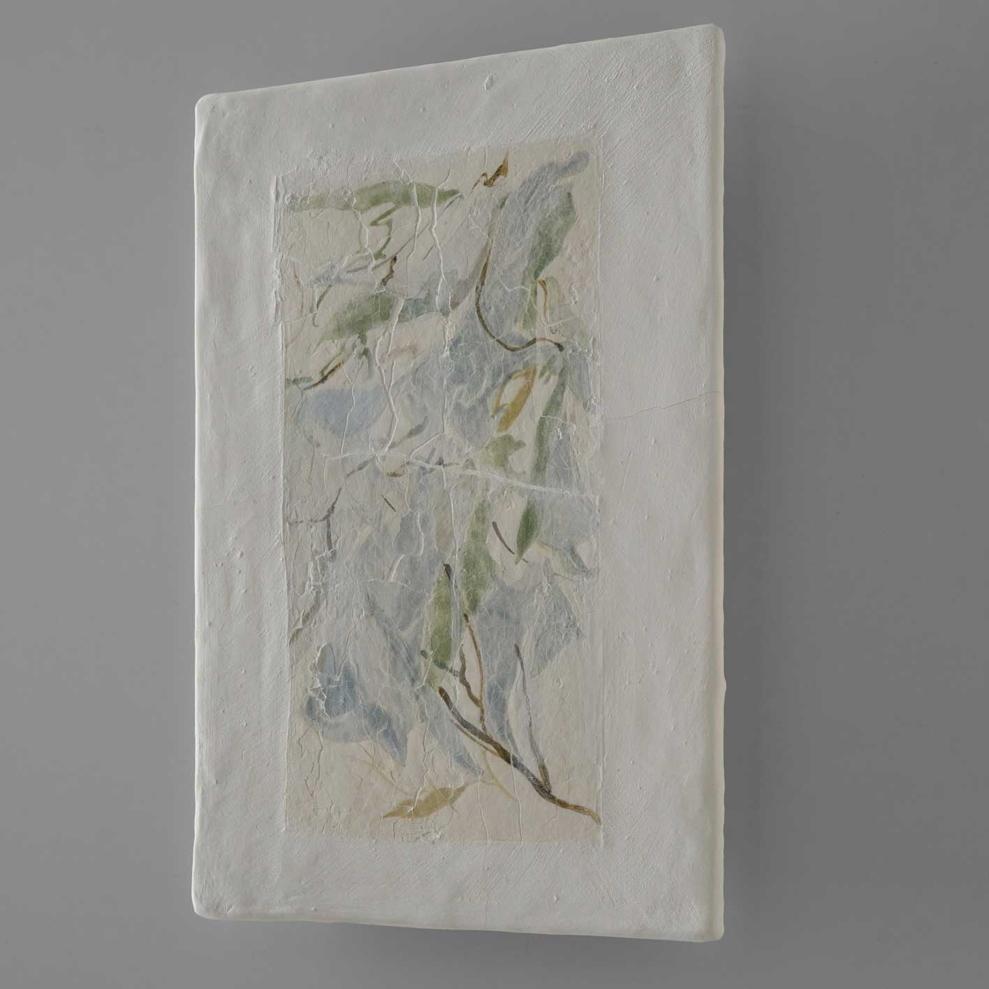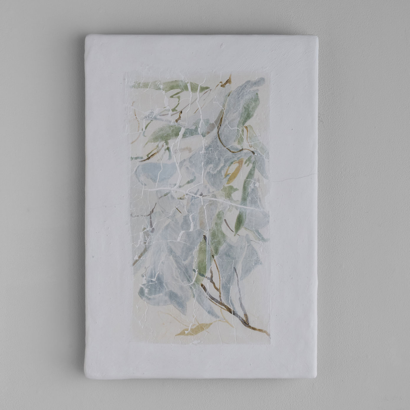 花が互いに小さく、ささやきあっているような感じです。ヨーロッパの古い漆喰壁にかつて吸い込まれた湿気などを想像しながら制作しました。