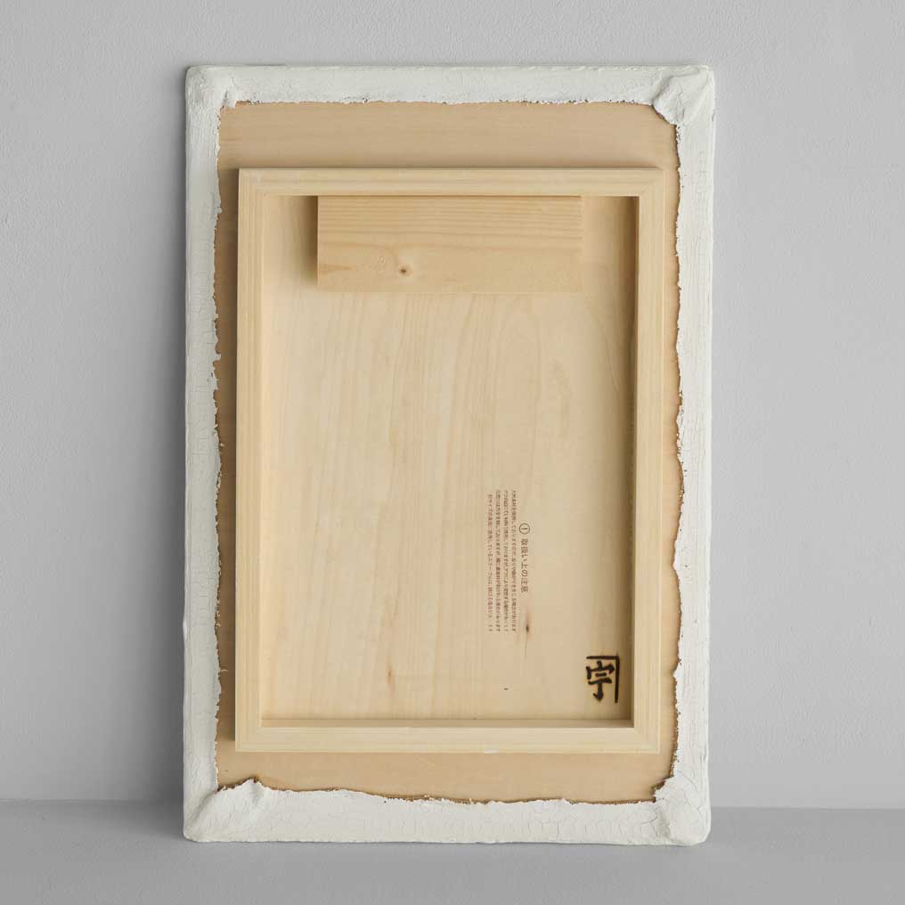 The fixture on the back is a dokko type, a traditional Japanese peg used for hanging objects, but it can also be converted to a string hanging system if desired.