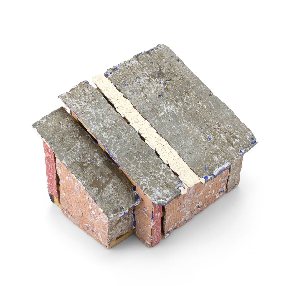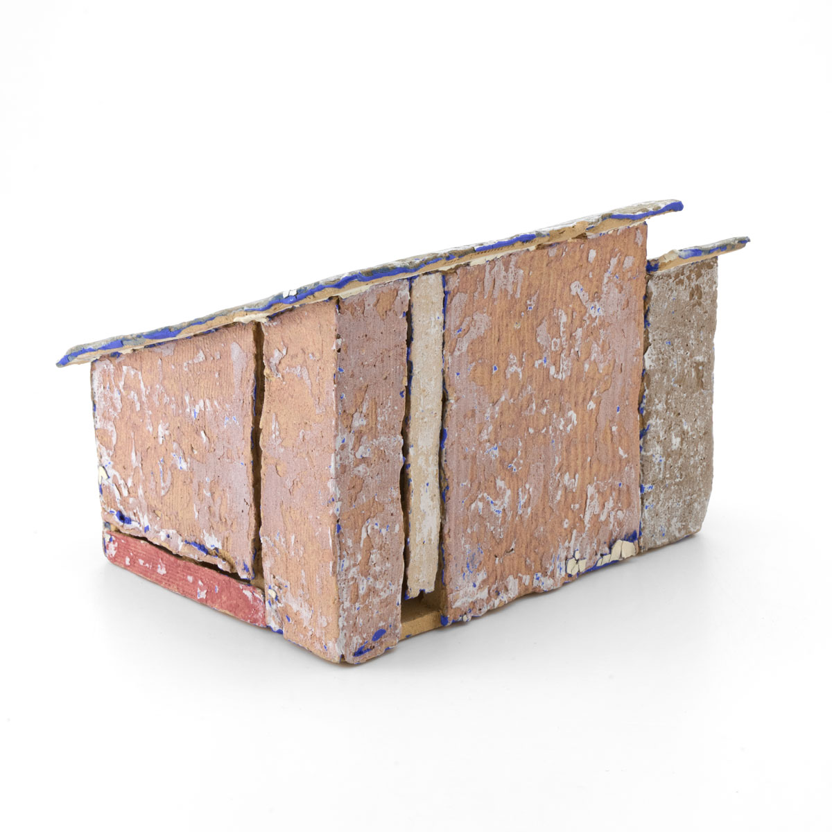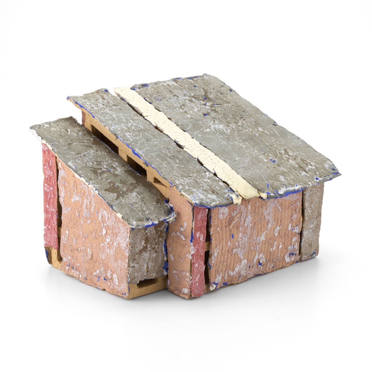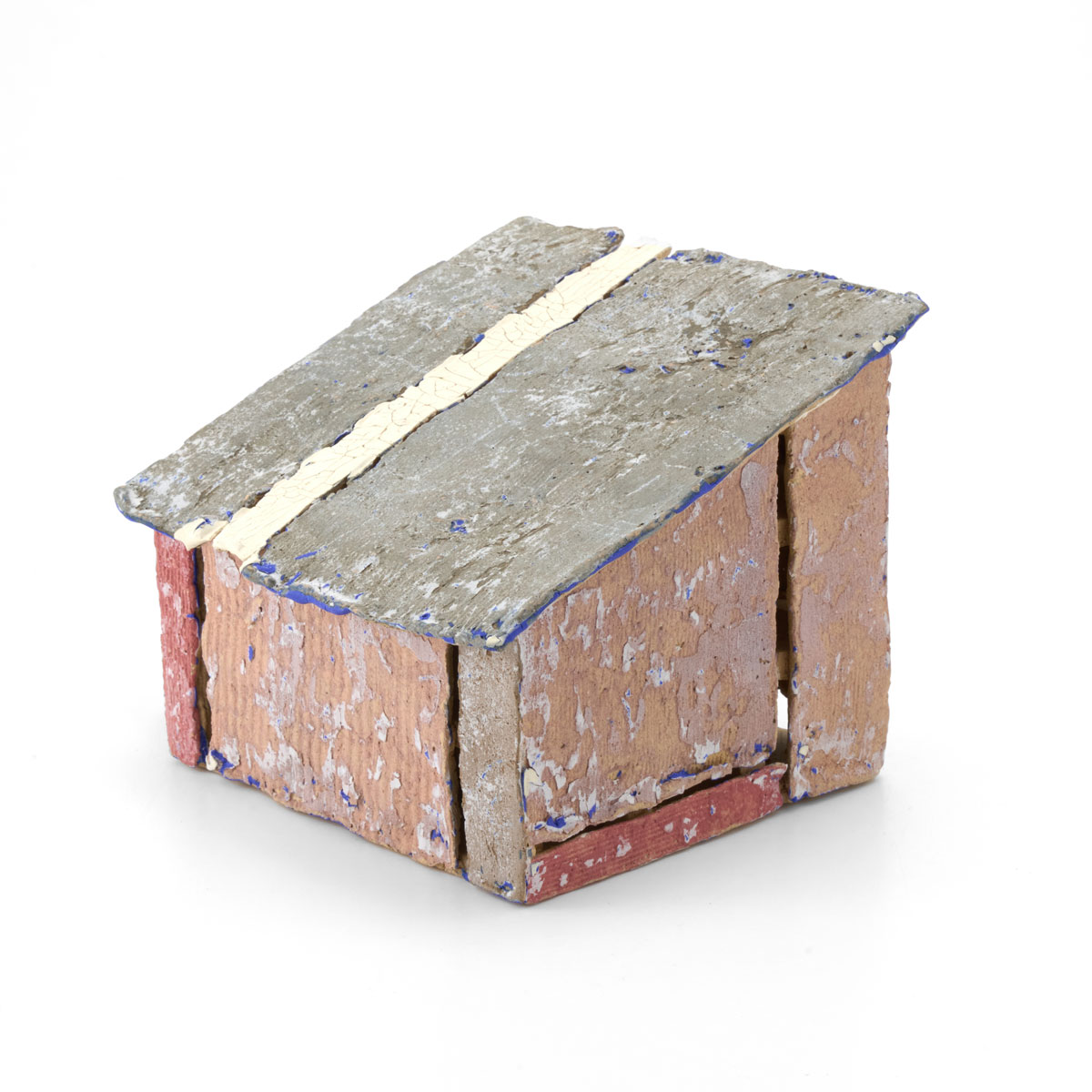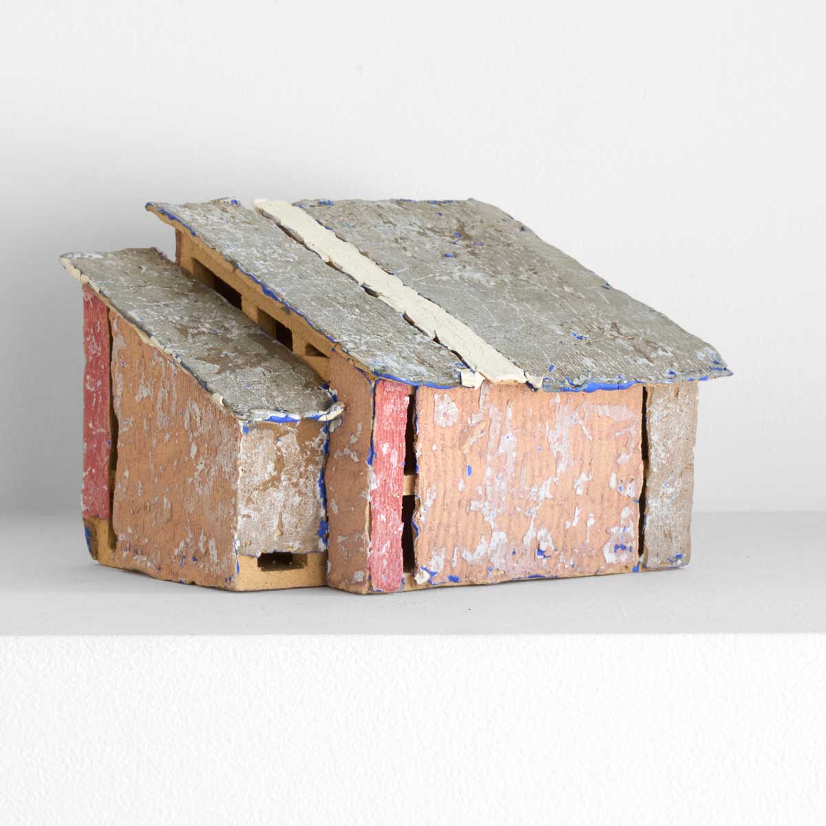 海辺や畑の片隅、車窓の景色の中にひっそりと佇むトタンの小屋。まずは構造を作り、その後薄い陶板を使いトタンやベニヤ板に見立てたパーツを貼って制作しています。表面を剥がす独特な技法で生み出される質感が魅力です。